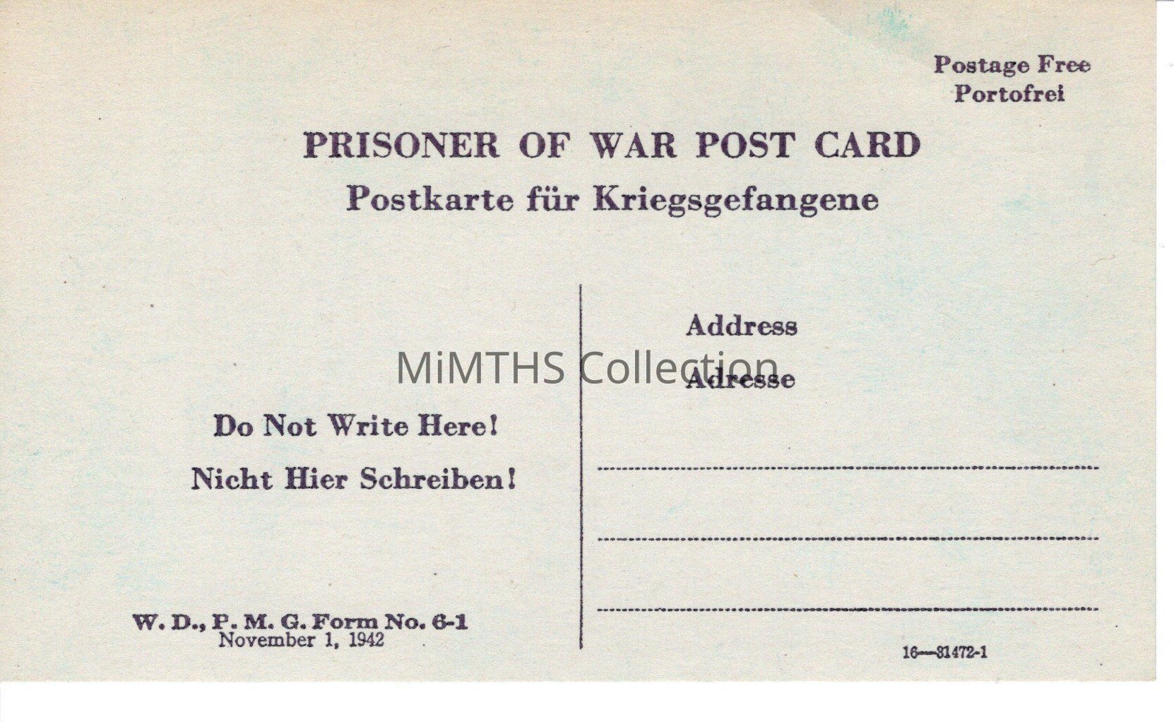 WDPMG Form No 6-1, November 1, 1942. Prisoner of War Post CardCataloged By