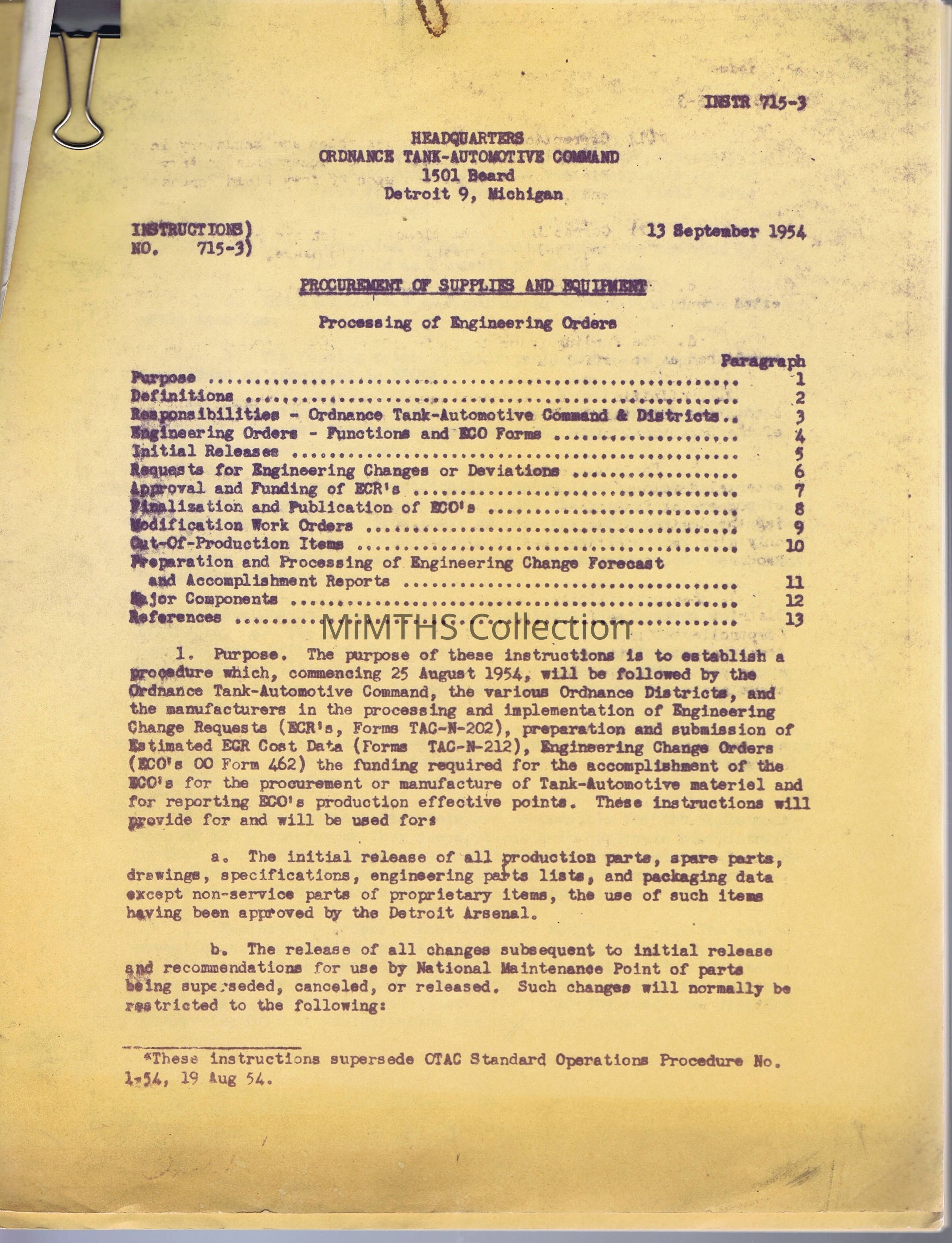 Procurement of Supplies and Equipment, Processing of Engineering Orders, HQ, Ordnance-Tank-Automotive Command, Detroit, MI
