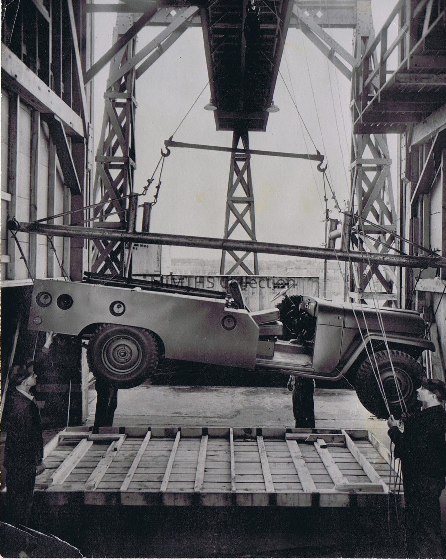 Black & White photo from the early 1950's of a prototype Willys military vehicle based on the Jeepster chassis. Photo is of the vehicle undergoing lift tests. From the Mitchell Bentley collection, MB made the coachwork for this vehicle.