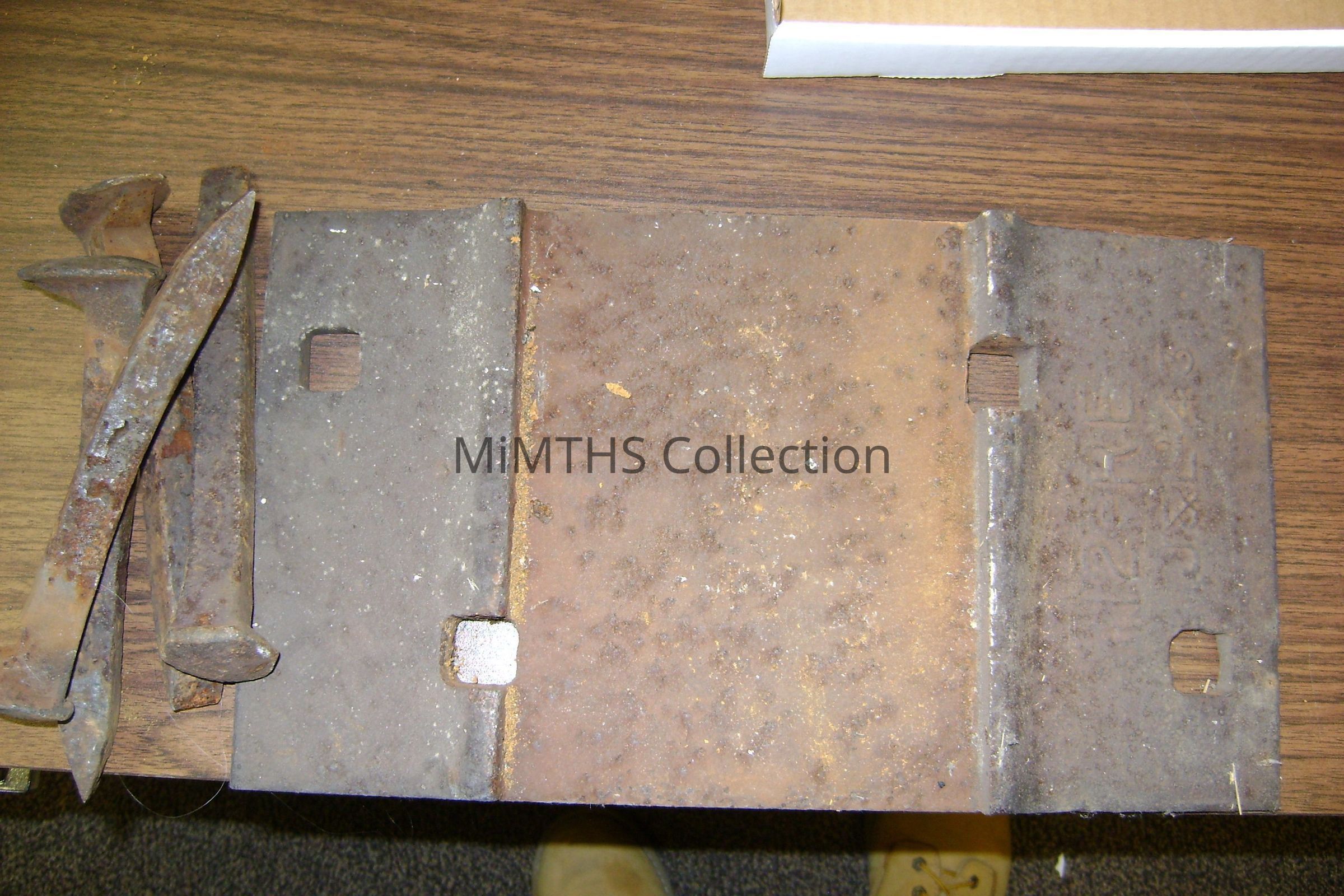This is a railroad rail support and 4 spikes dated 1943. This was part of the railroad line going into the Willow Run Bomber Plant. This rail line was cut during the construction of a new perimeter road and recovered by museum member Chris Causley @ 2006.Cataloged By