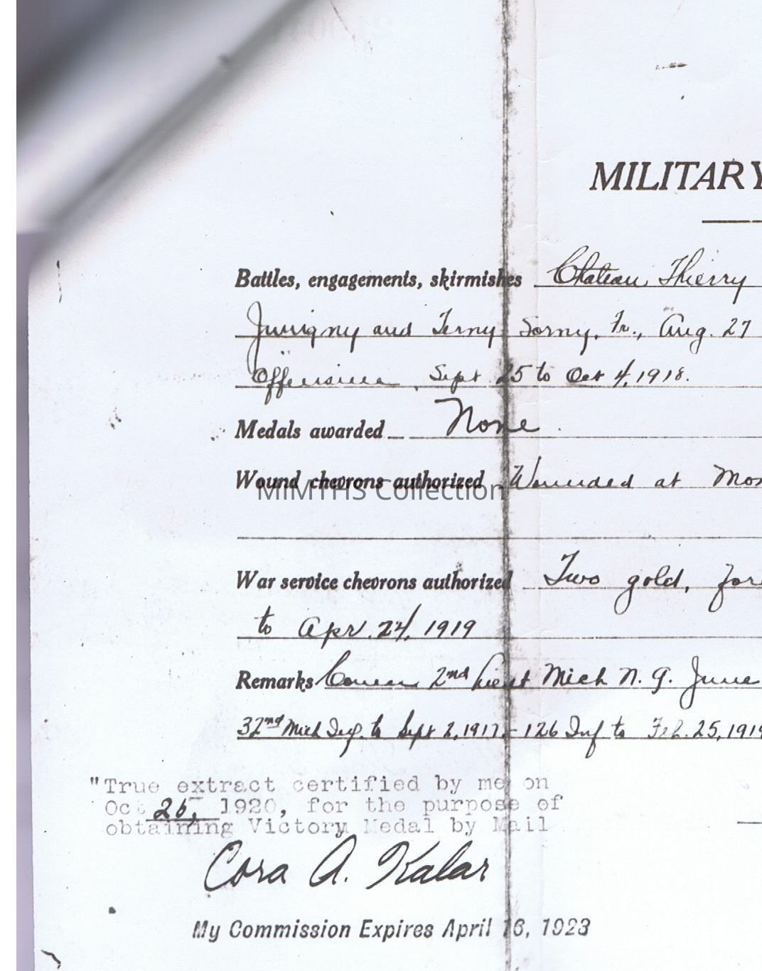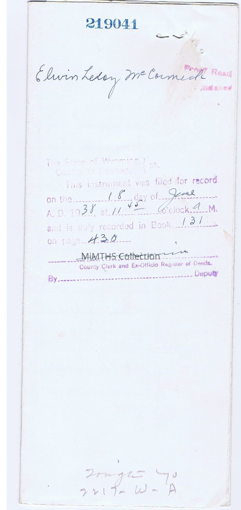 Honorable discharge issued to Elwin MCCormick on May 15, 1919 at Camp Custer, also includes military record from WWI, wounded, certified in MI 1923. Documents were rerecorded in WY in 1938.Cataloged By