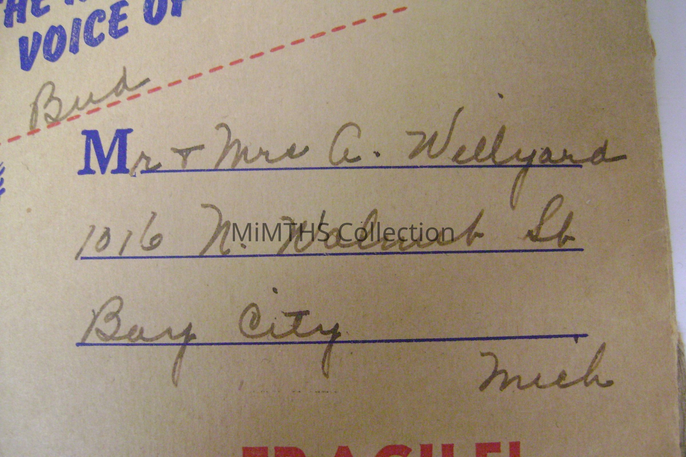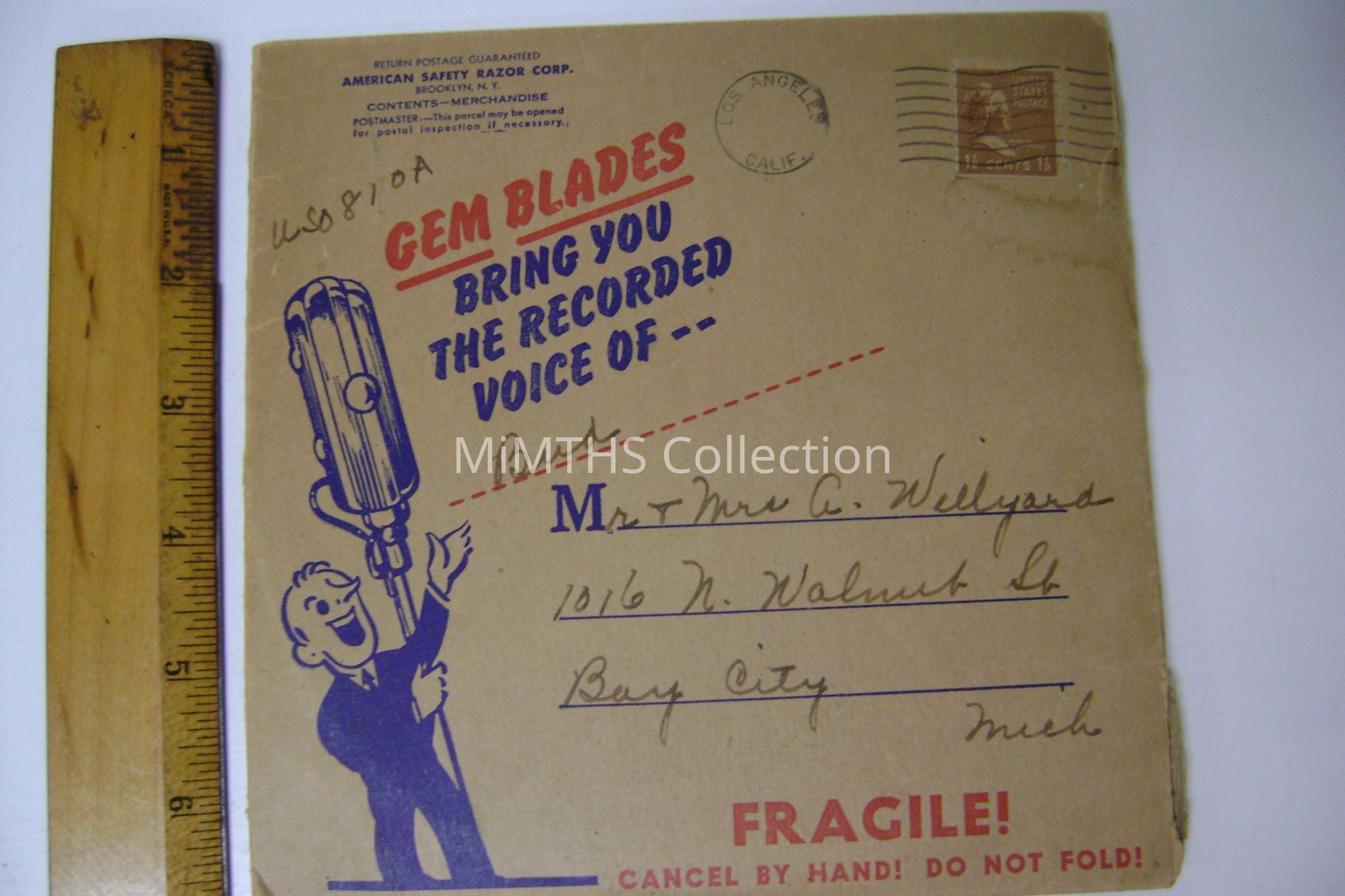 The American Safety Razor Corporation produced what appears to be a cardboard record with one Willyard's recorded voice. The postage stamp and description indicates that it was sent to Bay City Michigan. Two records are inside a cardboard parcel.Cataloged By