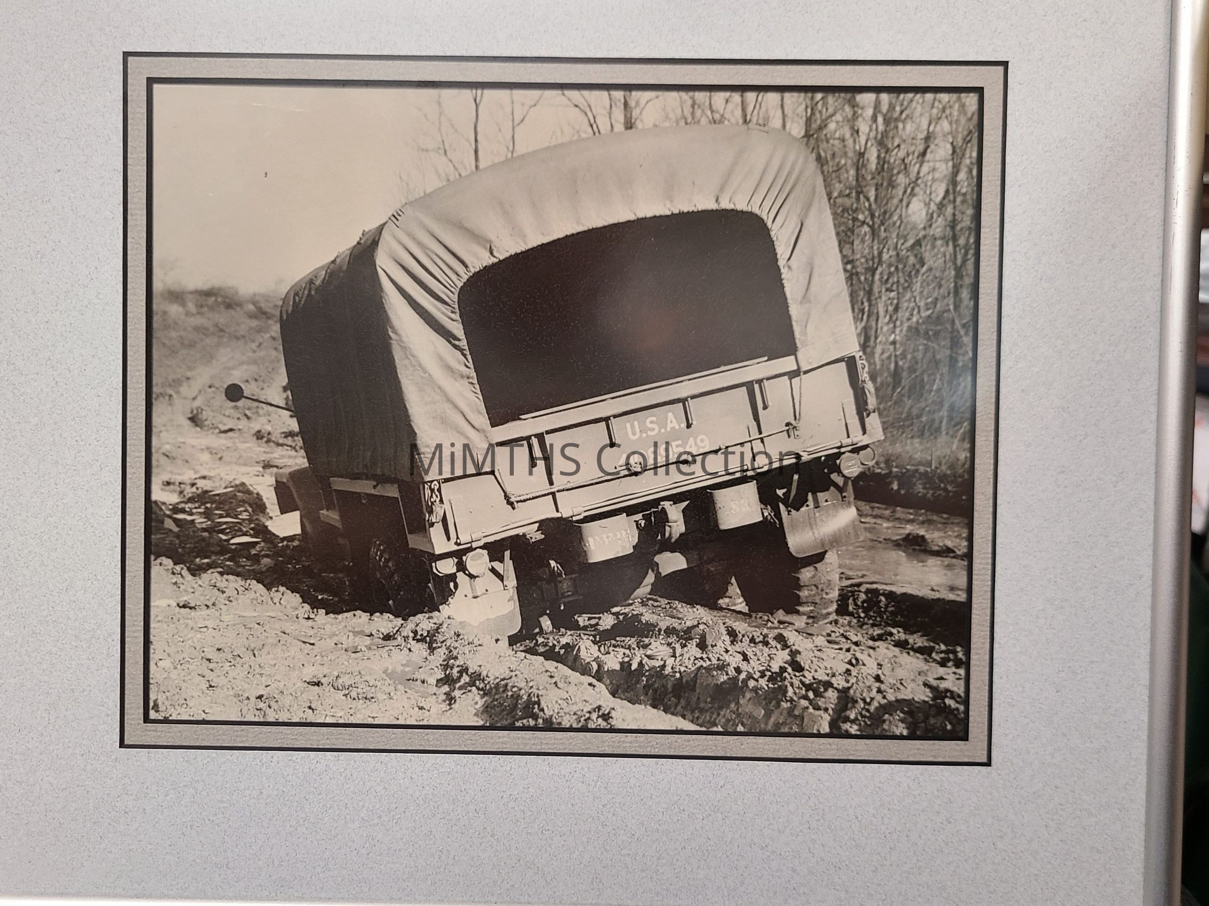 Photo from the Mitchell Bently collection, shows a REO 2 1/2 ton truck in mud. Ionia Mfg made the canvas trucks for these trucks.Cataloged By