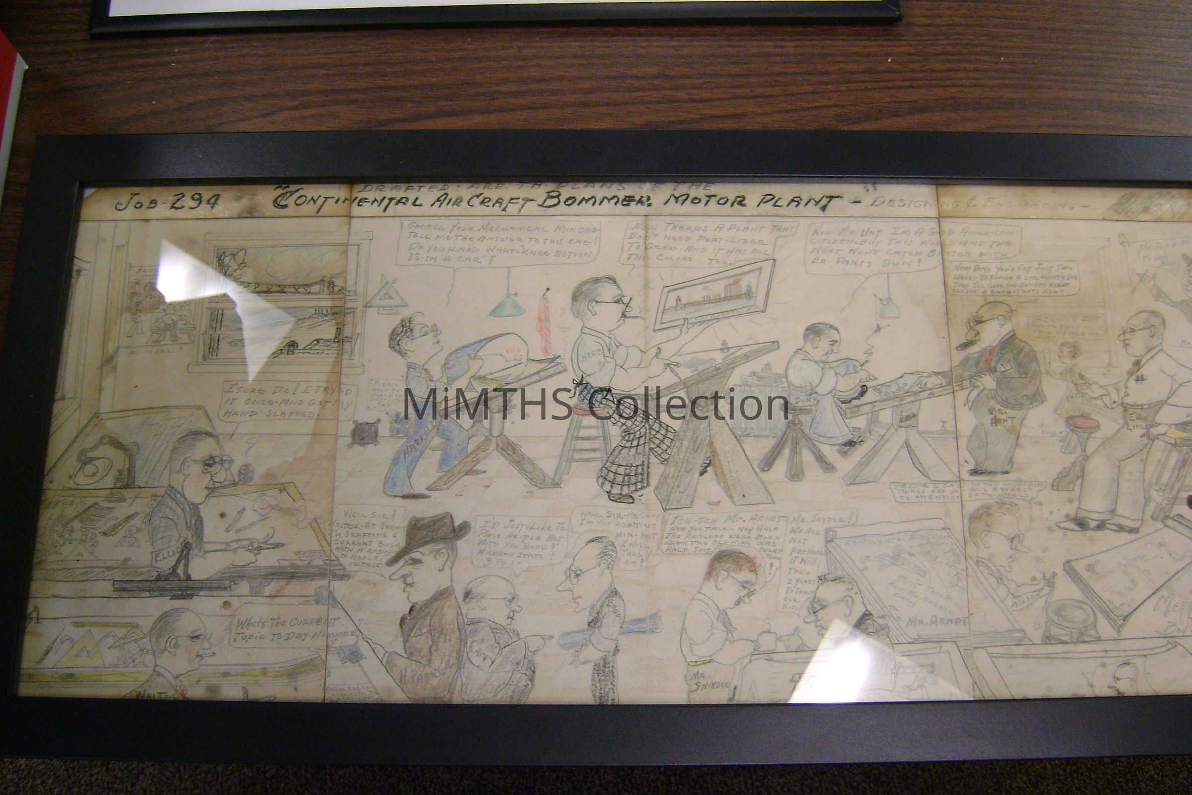 We have not been able to find any information on the Russel Engineering Co., but based on the view from the window in the sketch, it appears to have been located on the river near the Ambassador Bridge. In addition, the plant rendering held by the gentleman in the center of the drawing does not resemble any of the Continental Engine plants we know of, so perhaps they did not get the contract?