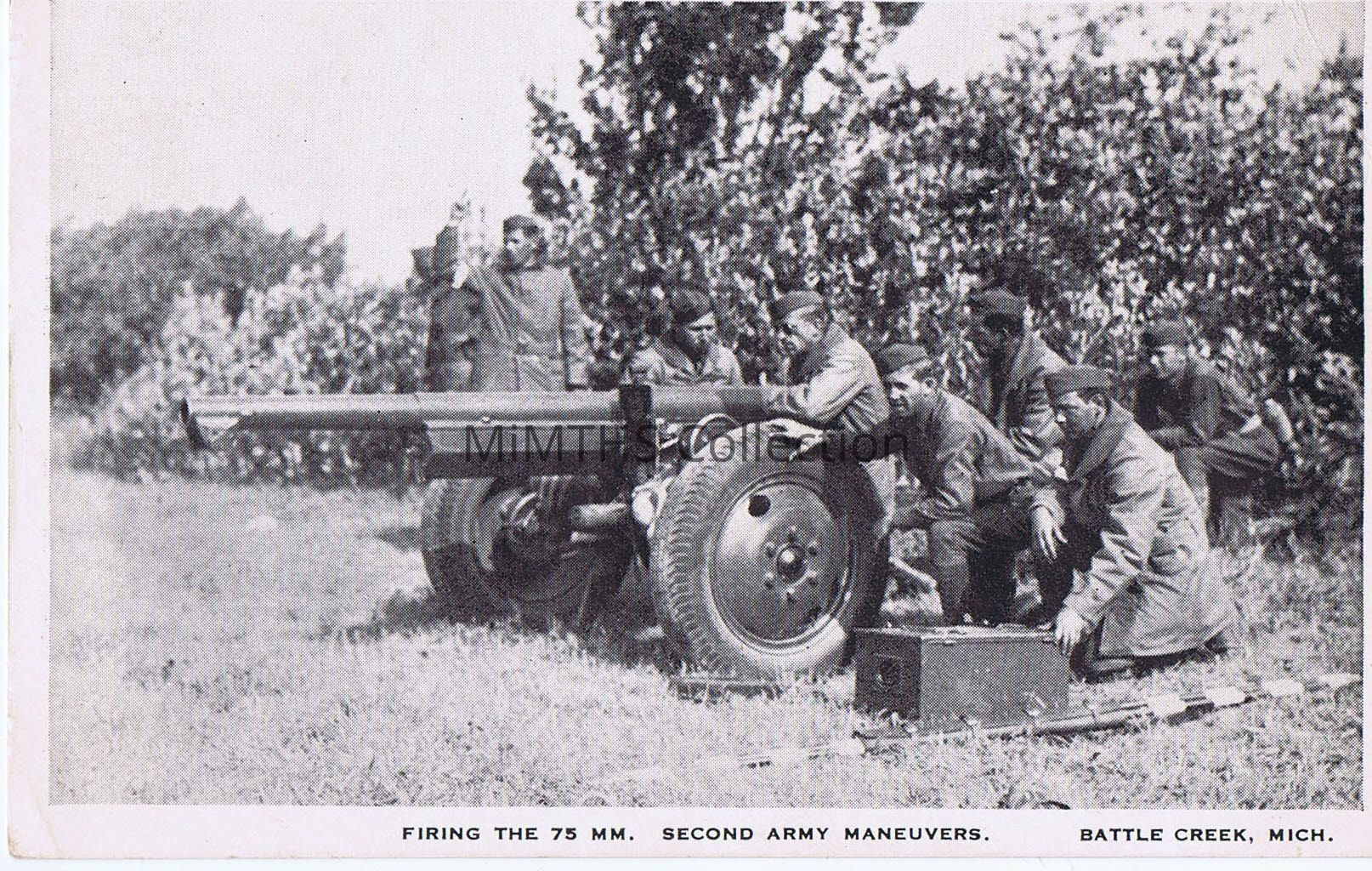 Postcard from 1936 Second Army Maneuvers In Battle Creek featuring 75MM Field Gun. ready to fire