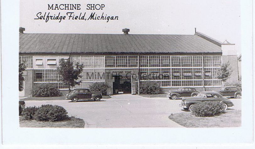 A small souvenir photo in black and white. Printed in the top left "Machine Shop Selfridge Field, Michigan" Image depicts Machine shop and four cars parked outside. The shop doors are open and there appears to be another vehicle inside.Photograph Details