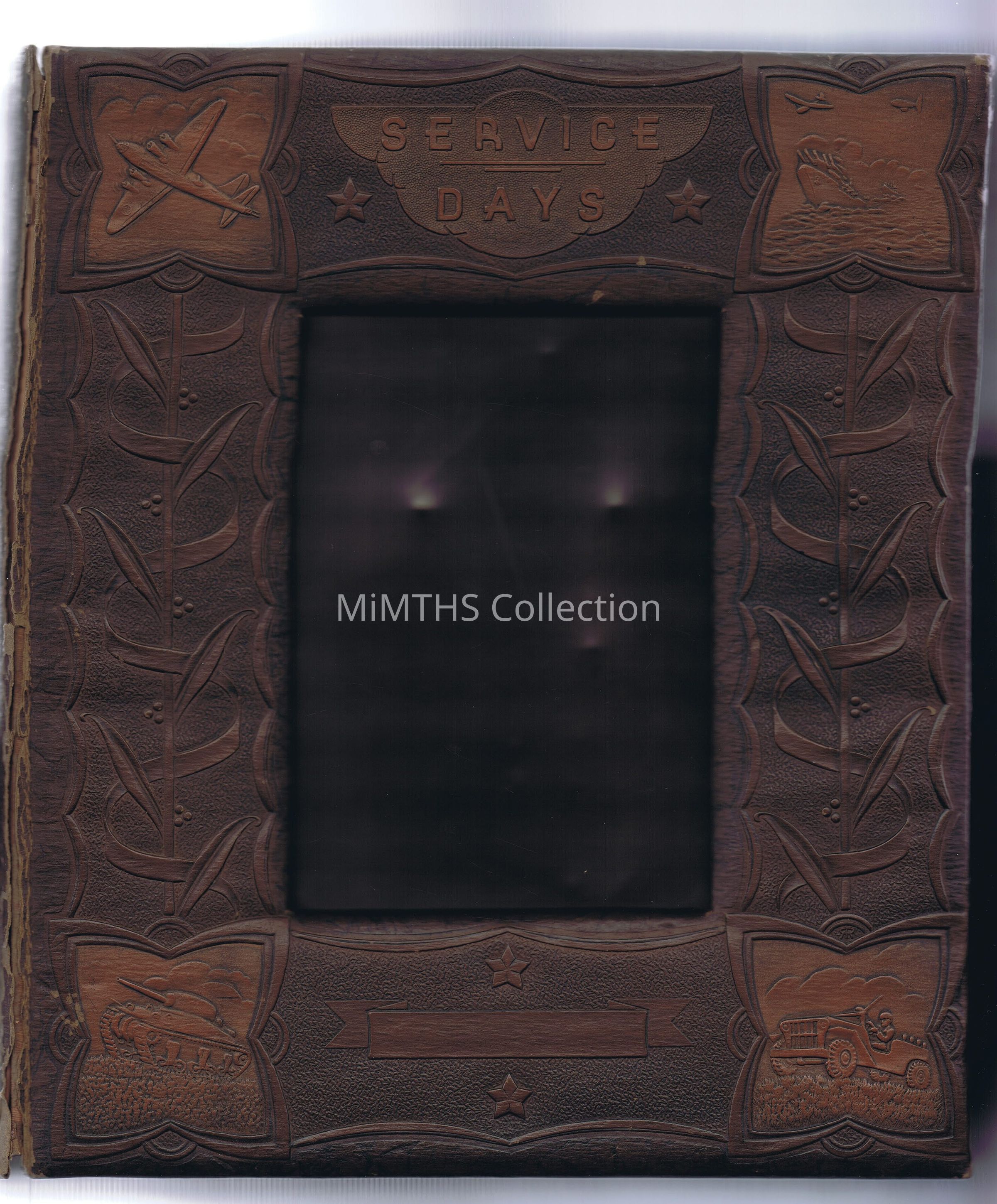 Service days" leather scrapbook box shaped like book, embossed with space for photo, 1ft long, 10.5in wide, marked with sticker "Souvenir's." Made by Geo. C. Knight Co., Detroit Michigan