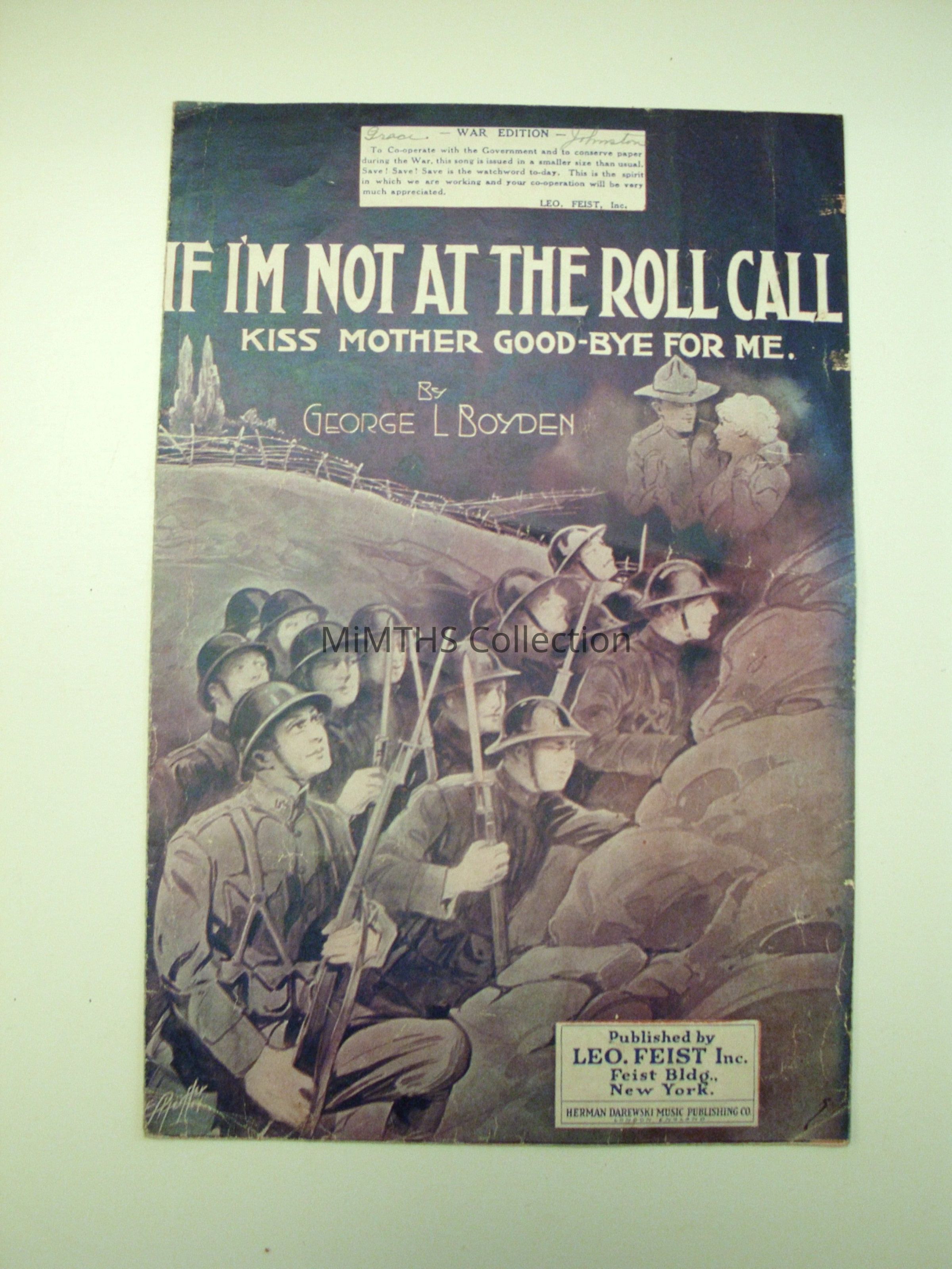 Sheet Music to "If I'm Not At Roll Call, Kiss Mother Good Bye For me" 1918 datedCataloged By