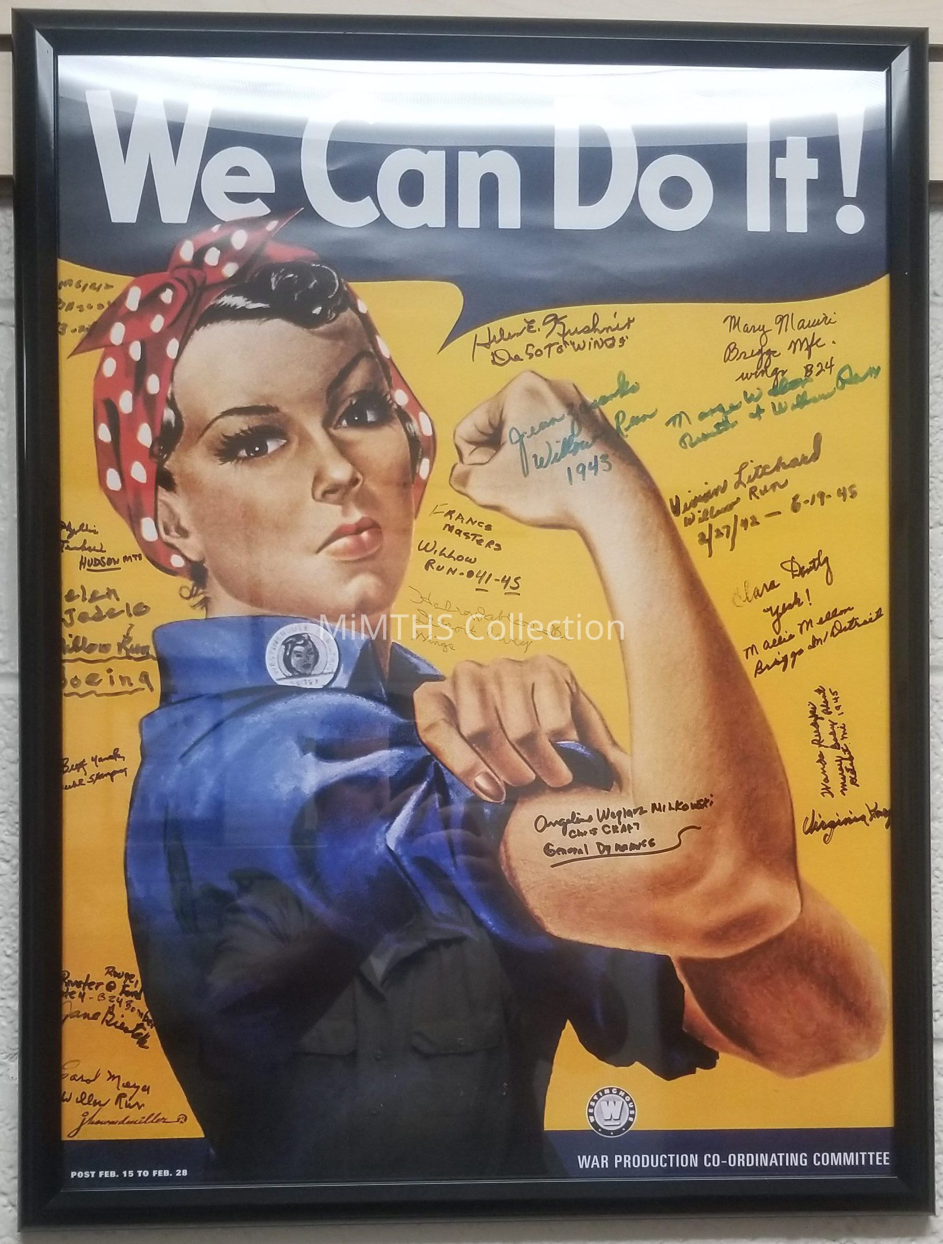Reproduction "We Can Do It!" Rosie poster signed by WWII "Rosie's" that visited the museum.