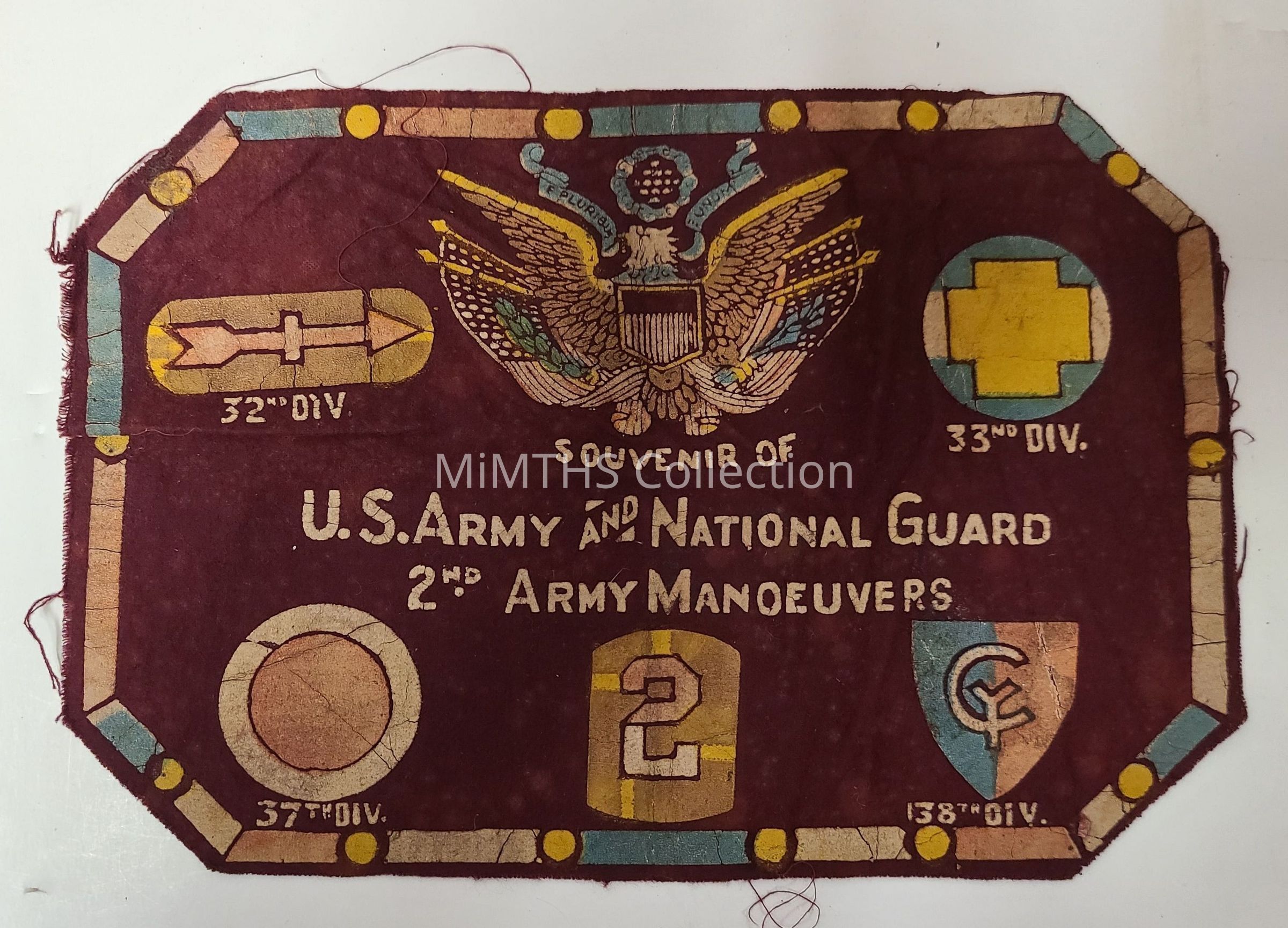 Souvenir of the U.S. Army and National Guard 2nd Army Maneuvers. Paint on velvet. Features the divisional logos of the four divisions that participated.