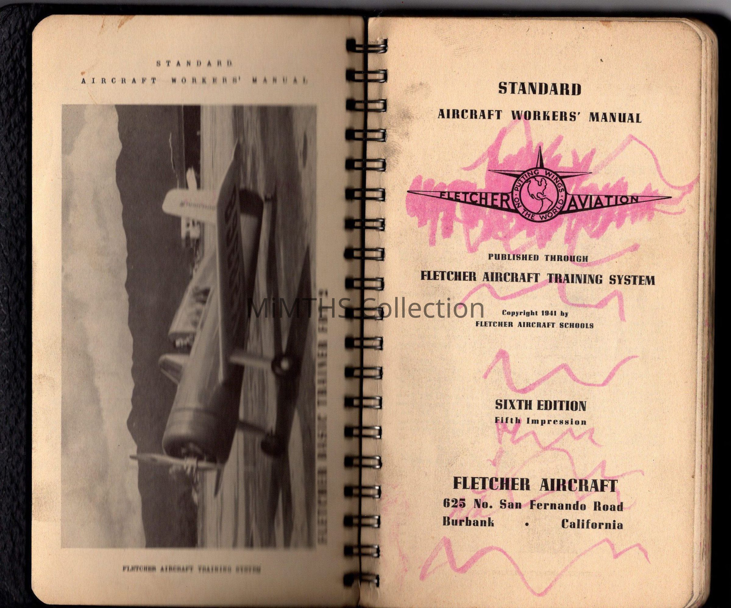 Pocket sized spiral bound aircraft workers manual from Fletcher Aircraft in San Bernadino CA. 1941 dated.