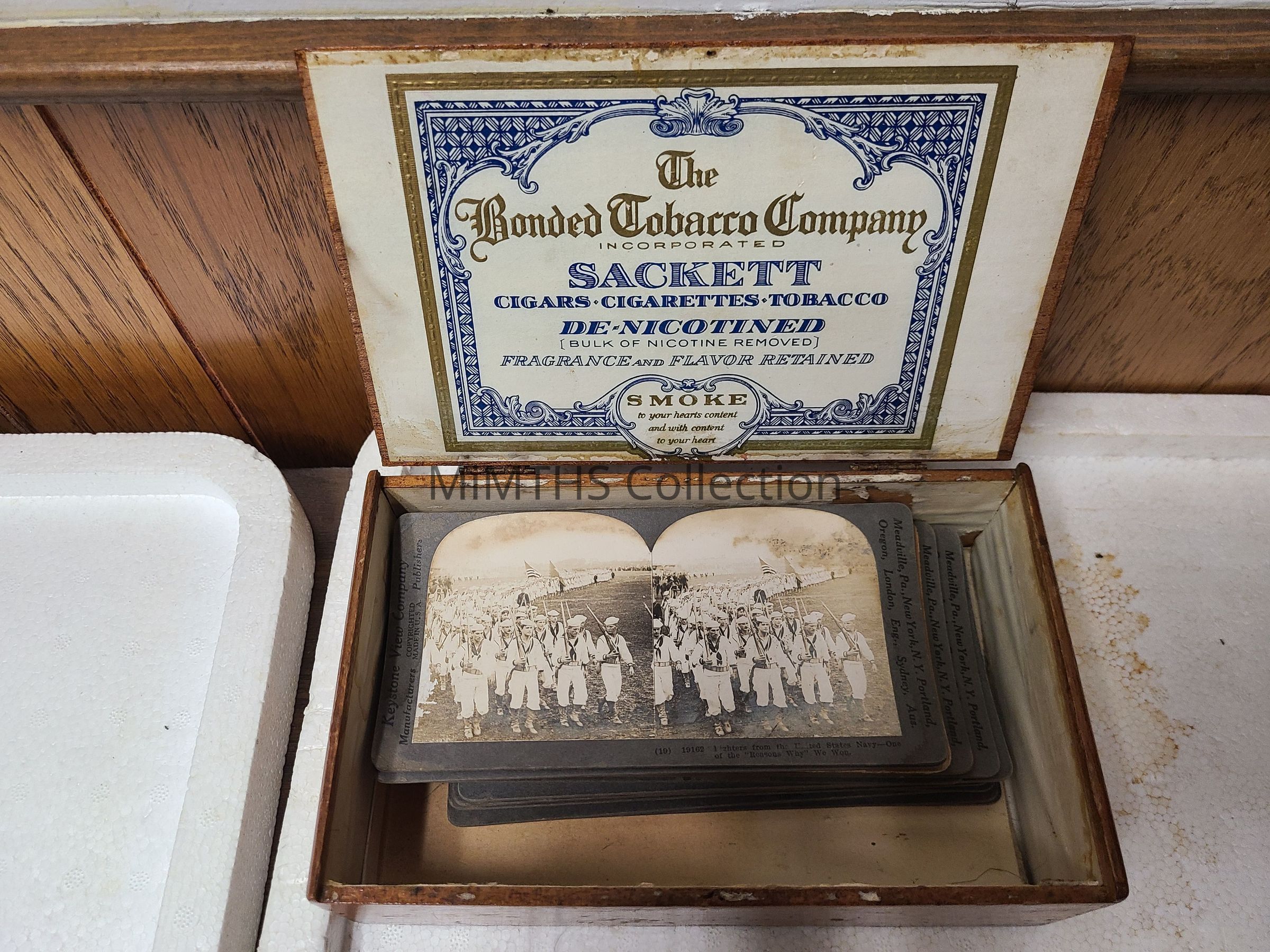 Stereoscope with a box of 20 WWI era images in a wooden cigar box.