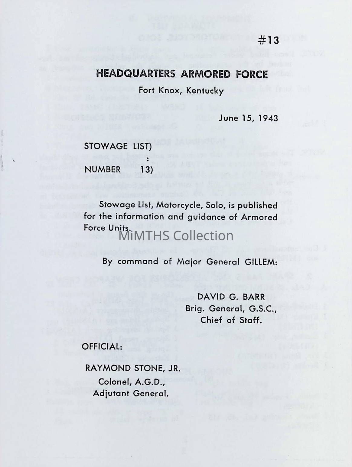 Storage List #13, Motorcycle, Solo, HQ, Armored Force, Fort Knox, KY