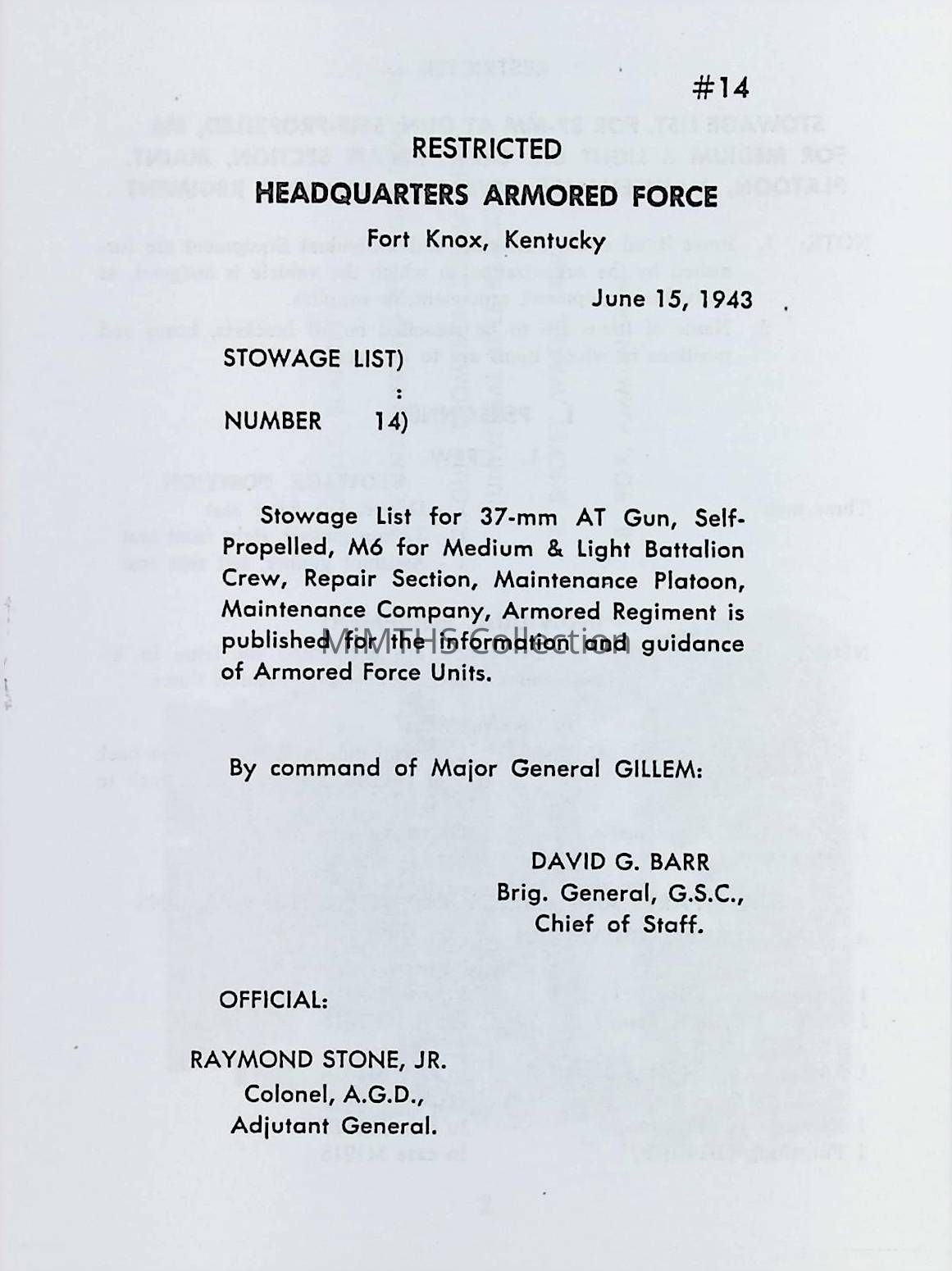 Stowage List #14, 37-mm AT Gun, Self-Propelled M-6, HQ, Armored Force, Fort Knox, KY