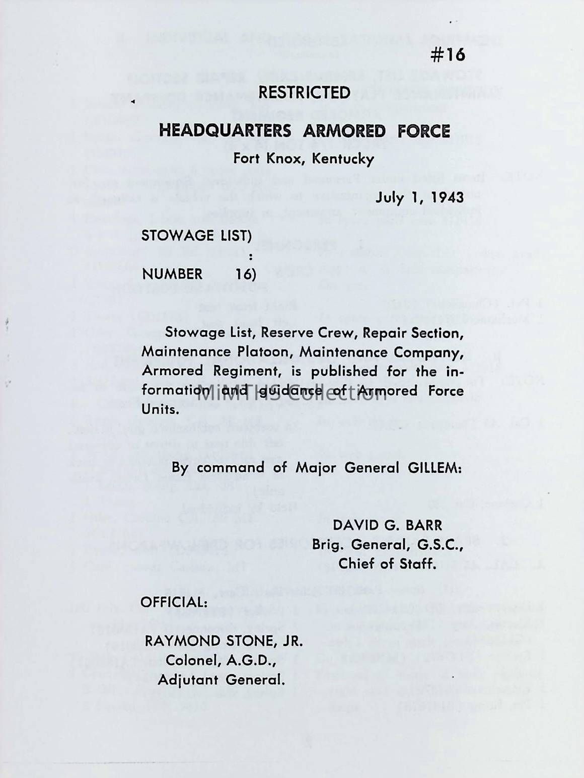 Stowage List #16, Reserve Crew, Repair Section, HQ, Armored Force, Fort Knox, KY