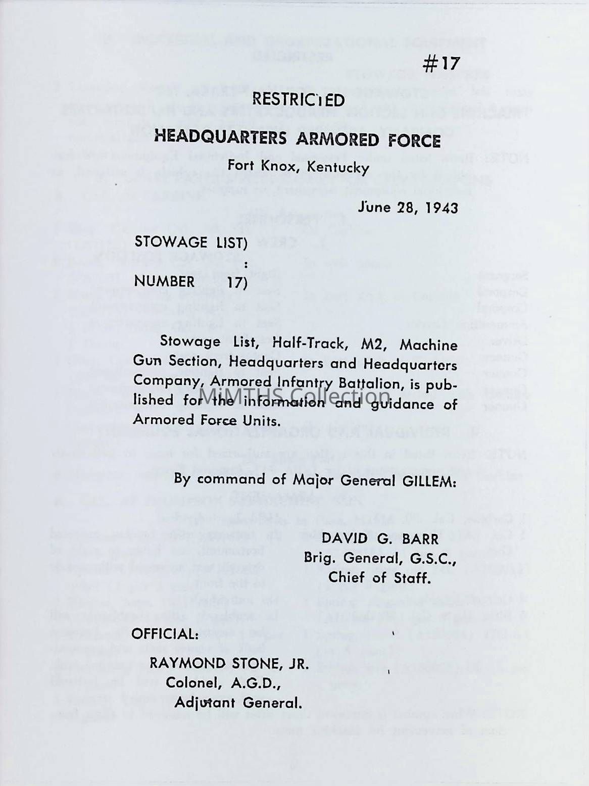 Stowage List #17, Half-Track, M2, Machine Gun Section, HQ, Armored Force, Fort Knox, KY