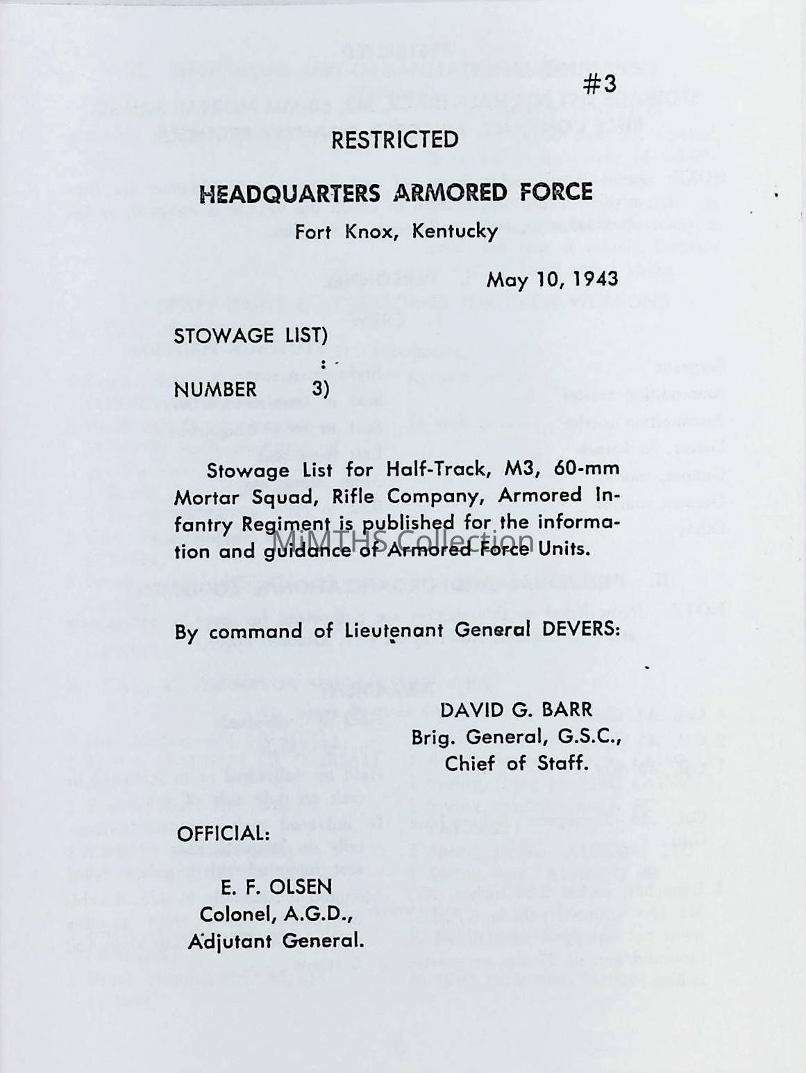 Stowage List #3, Half-Track,M3, 60-mm Mortar Squad HQ, Armored Force, Fort Knox, KY