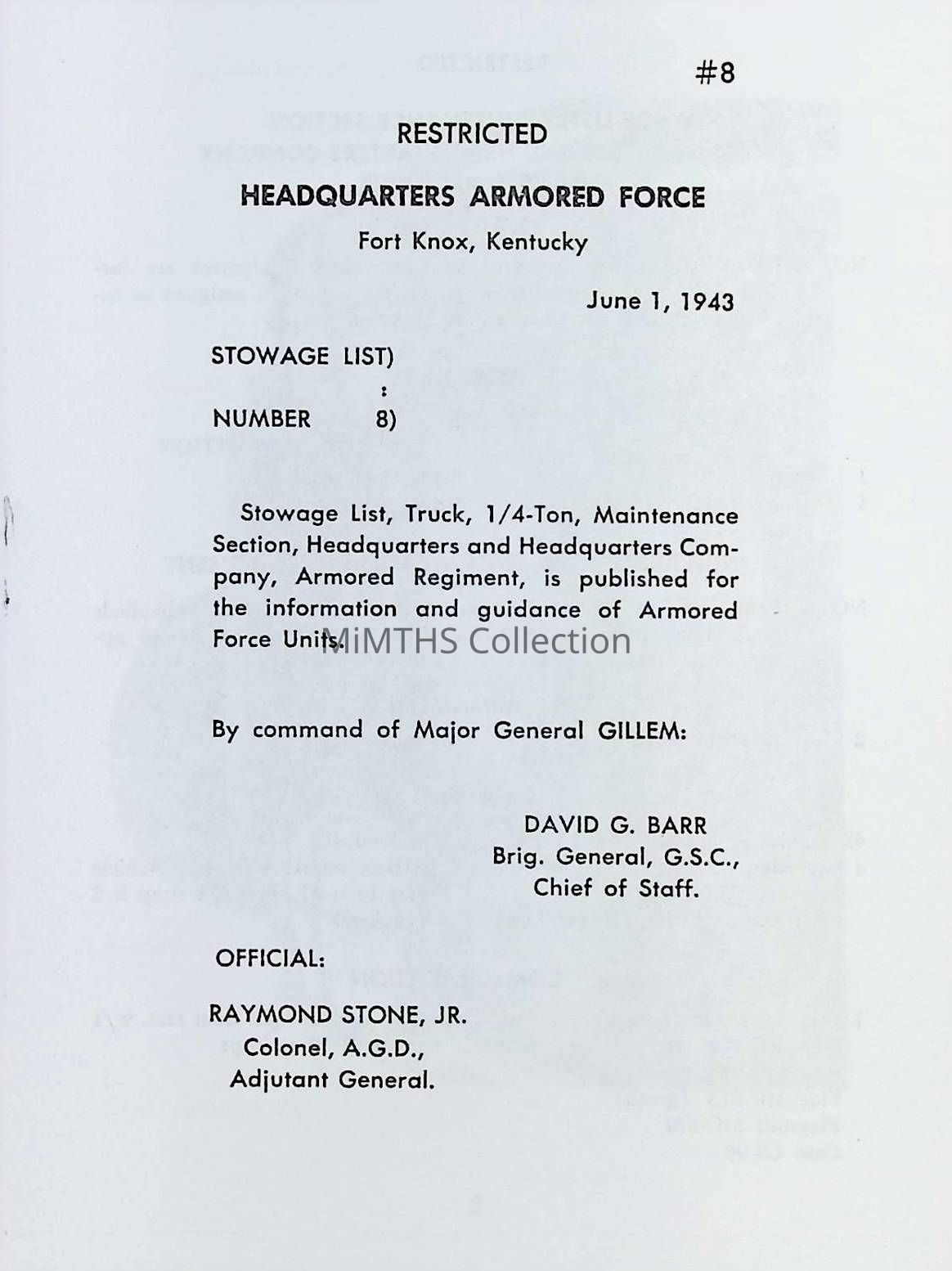 Stowage List #8, Truck, 1/4-Ton, Maintenance Section, HQ, Armored Force, Fort Knox, KY