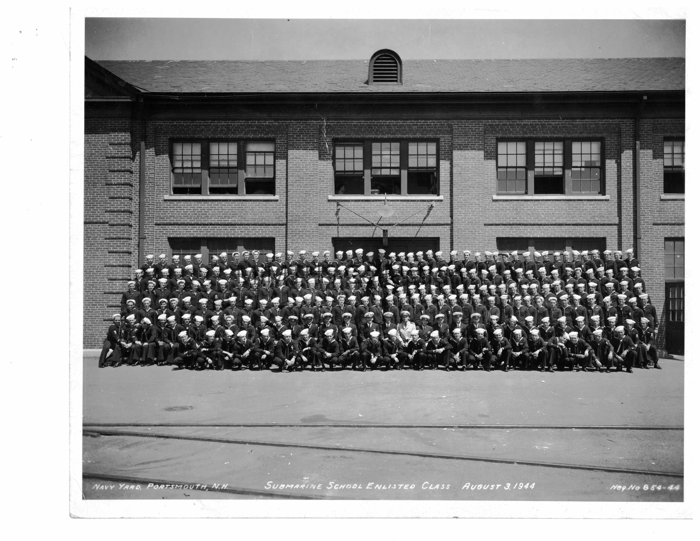 Image Students at Submarine School in Portsmouth, New Hampshire. The photo states that the picture was taken in the Navy Yard on August 3rd, 1944. Written on the back in red crayon says "LAZAR Y10".Cataloged By