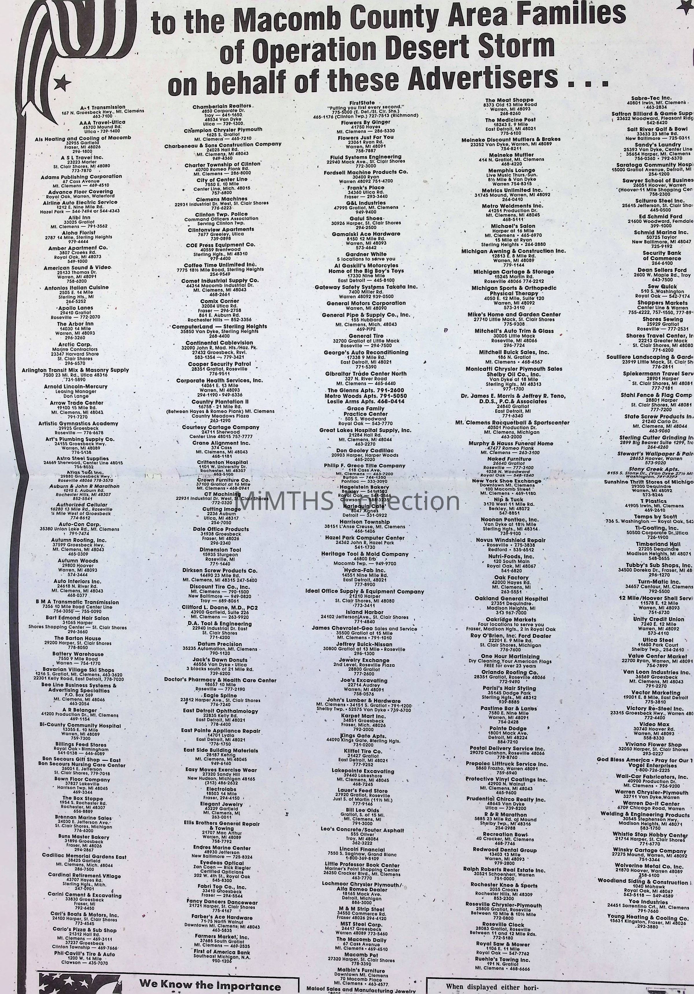Includes List of Macomb County business advertisers who contributed to a donation to military families and a series of iron on shirt logos.Cataloged By