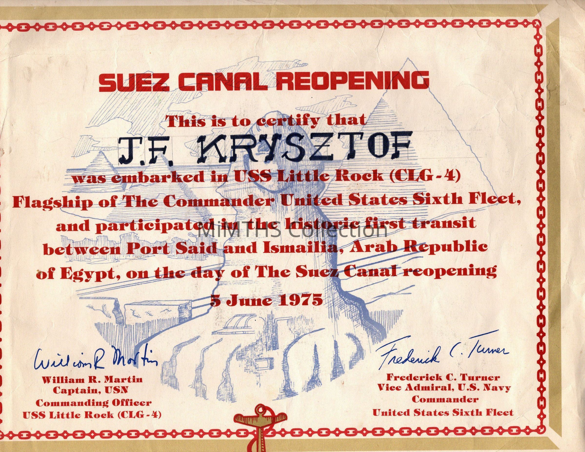 Certificate to show that J.F. Krysztof was aboard the USS Little Rock, flagship of the 6th Fleet, and participated in the first trip through the Suez Canal after its reopening 5 June 1975.Cataloged By