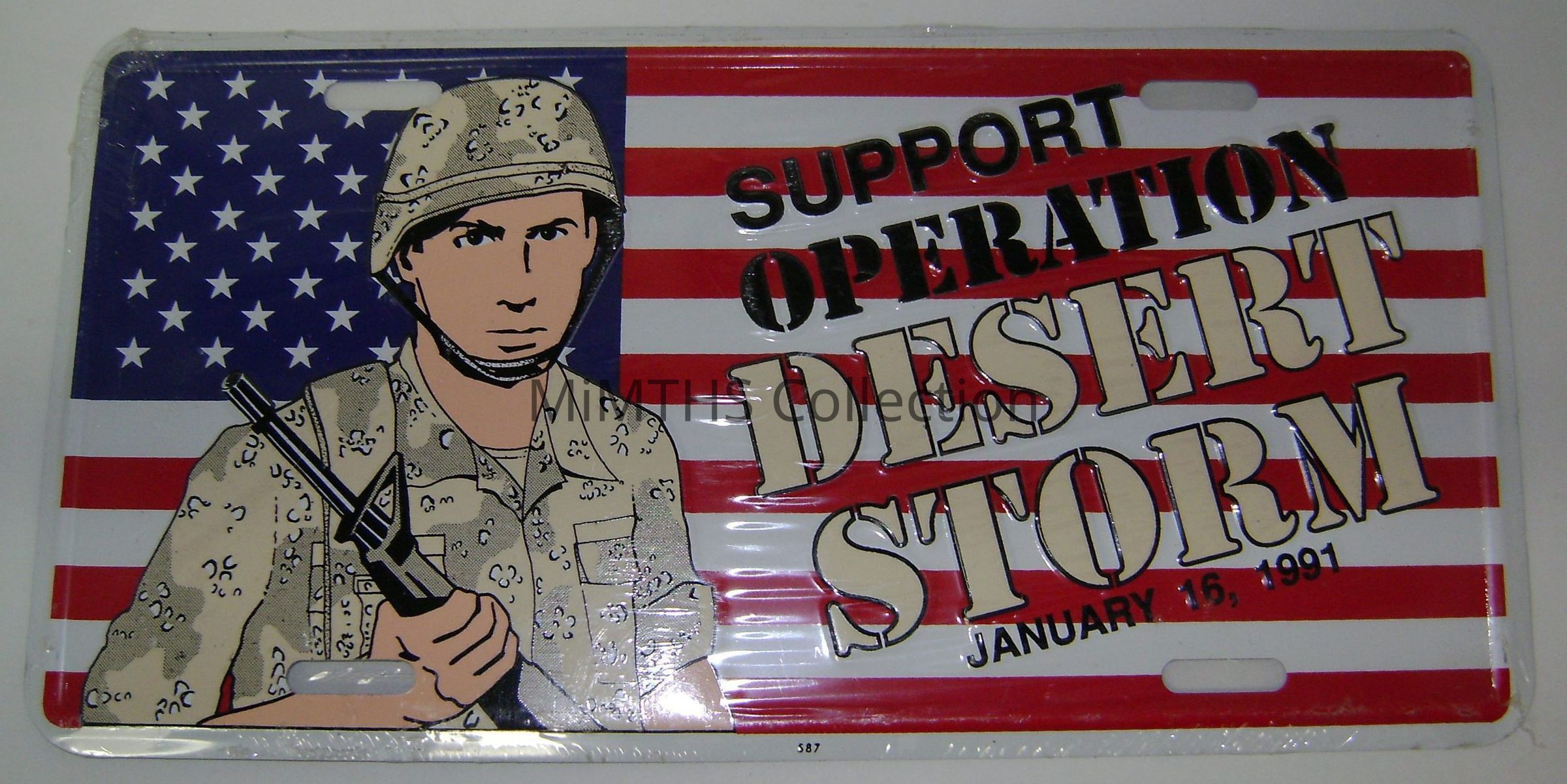 Decorative Vanity License plate with "Support Desert Storm" motif and soldier stamped into it.Cataloged By