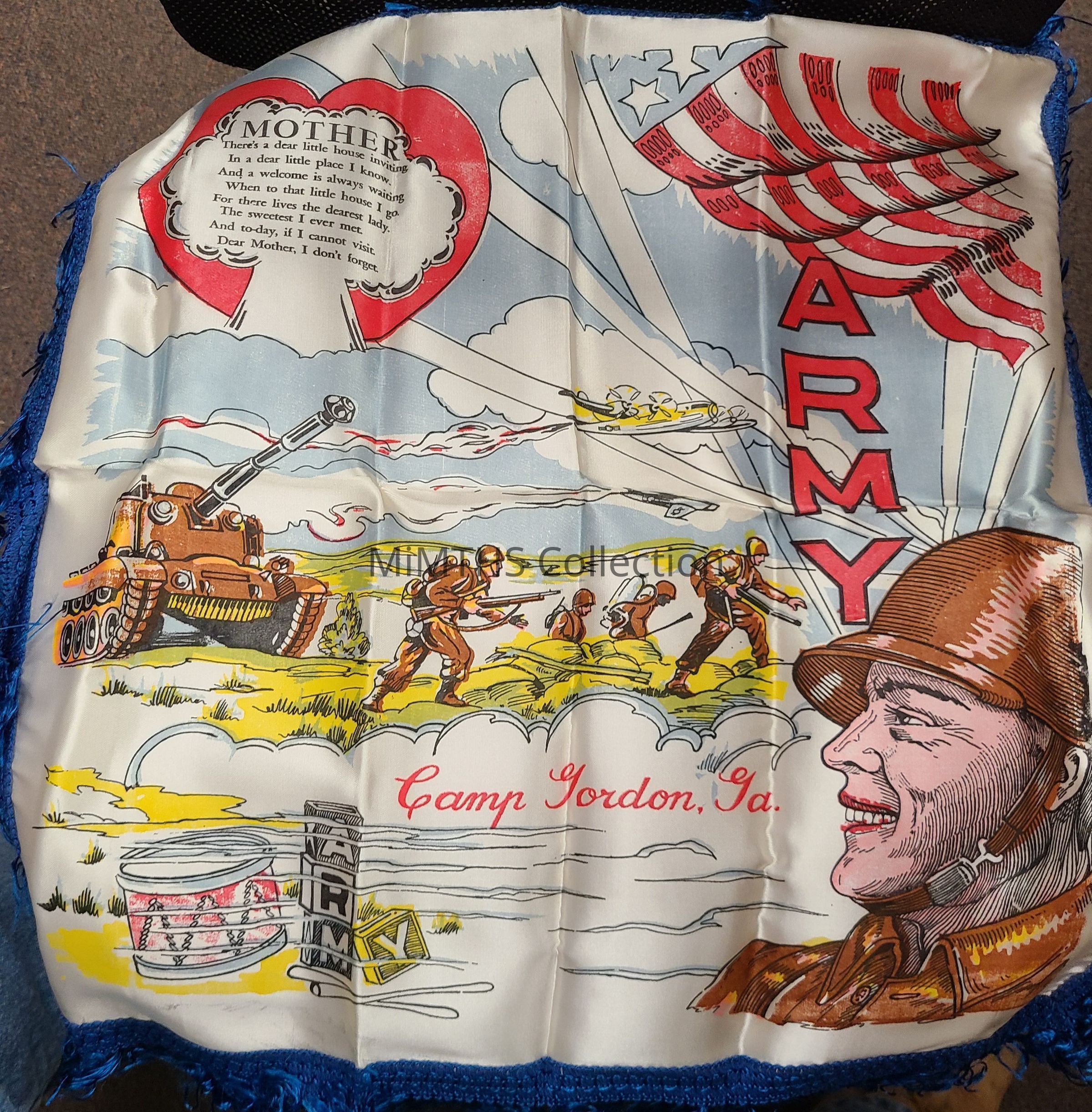 White Satin Sweetheart Pillow Cover with blue fringe with screenprinted illustration, the words "Army" and "Mother" and a small poem. From the collection of Brian MonroeCataloged By