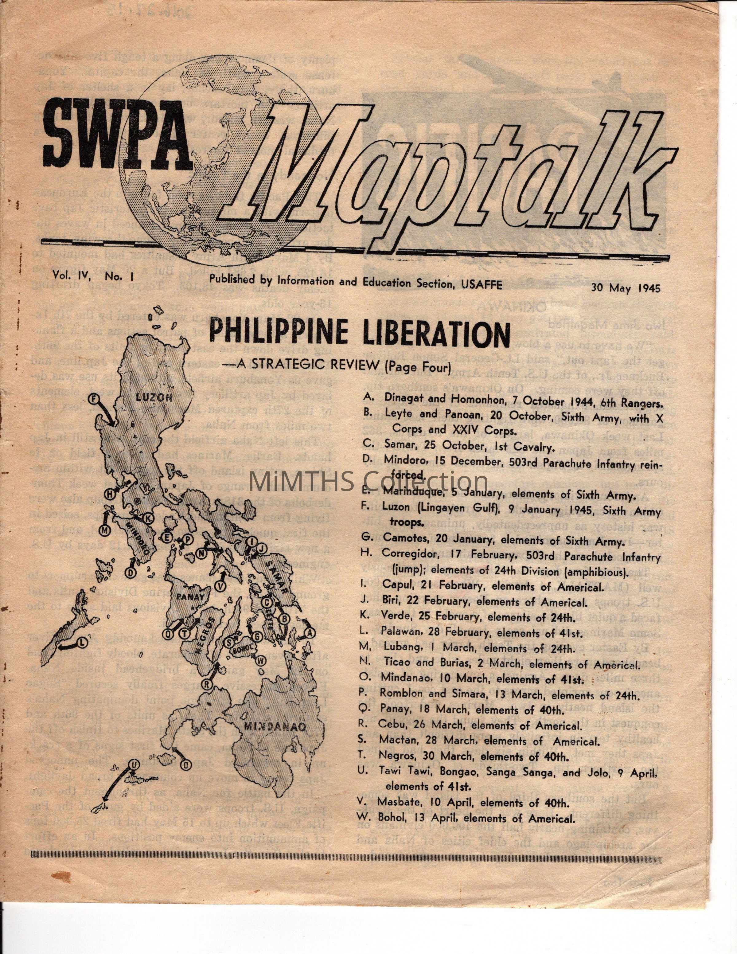 SWPA (South West Pacific) Maptalk, 30 May 1945, vol.4, No.1, published by Information and Education Section, United States Army Forces in the Far East (USAFFE)