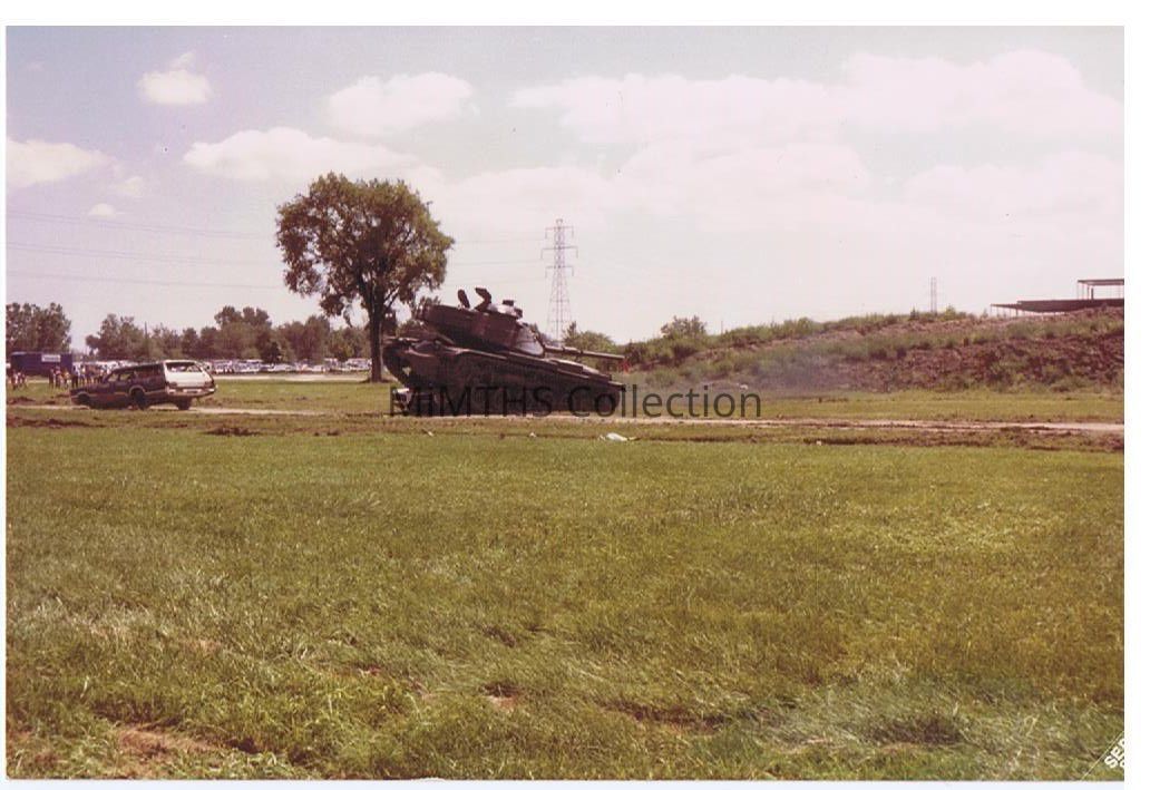 Photo taken at the 1980 TACOM Org Day showing an M60 tank crushing an OldsmobilePhotograph Details