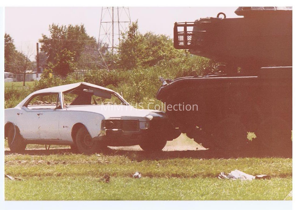 Photo taken at the 1980 TACOM Org Day showing an M60 tank crushing an OldsmobilePhotograph Details