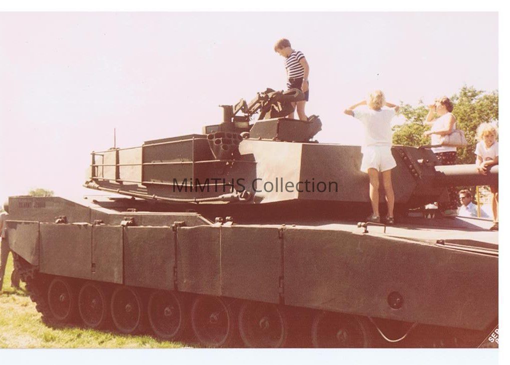 Photo taken at the 1980 TACOM Org Day showing an M1 Abrams Tank Museum founder Chris Causley is standing on the vehicle.Photograph Details