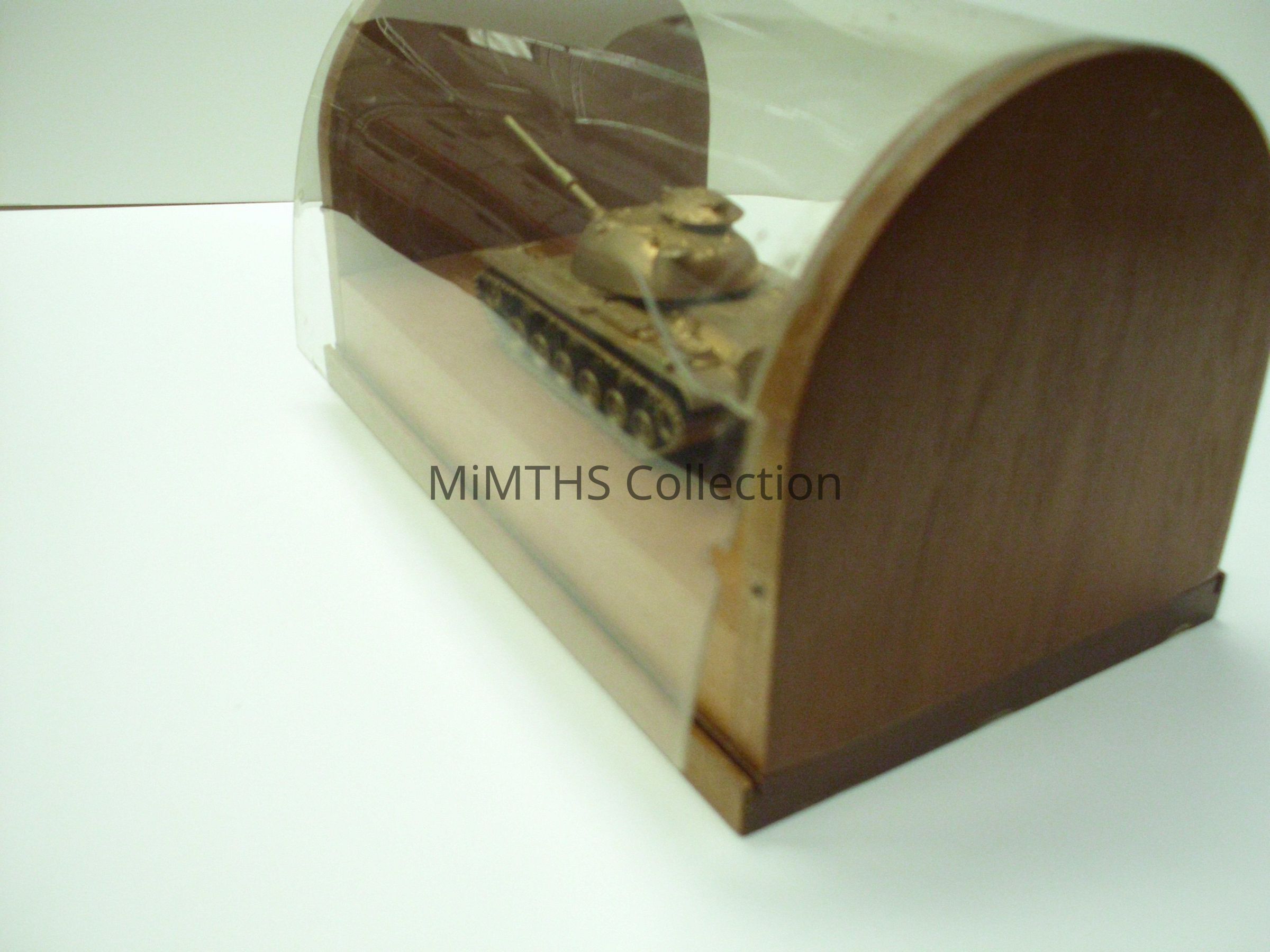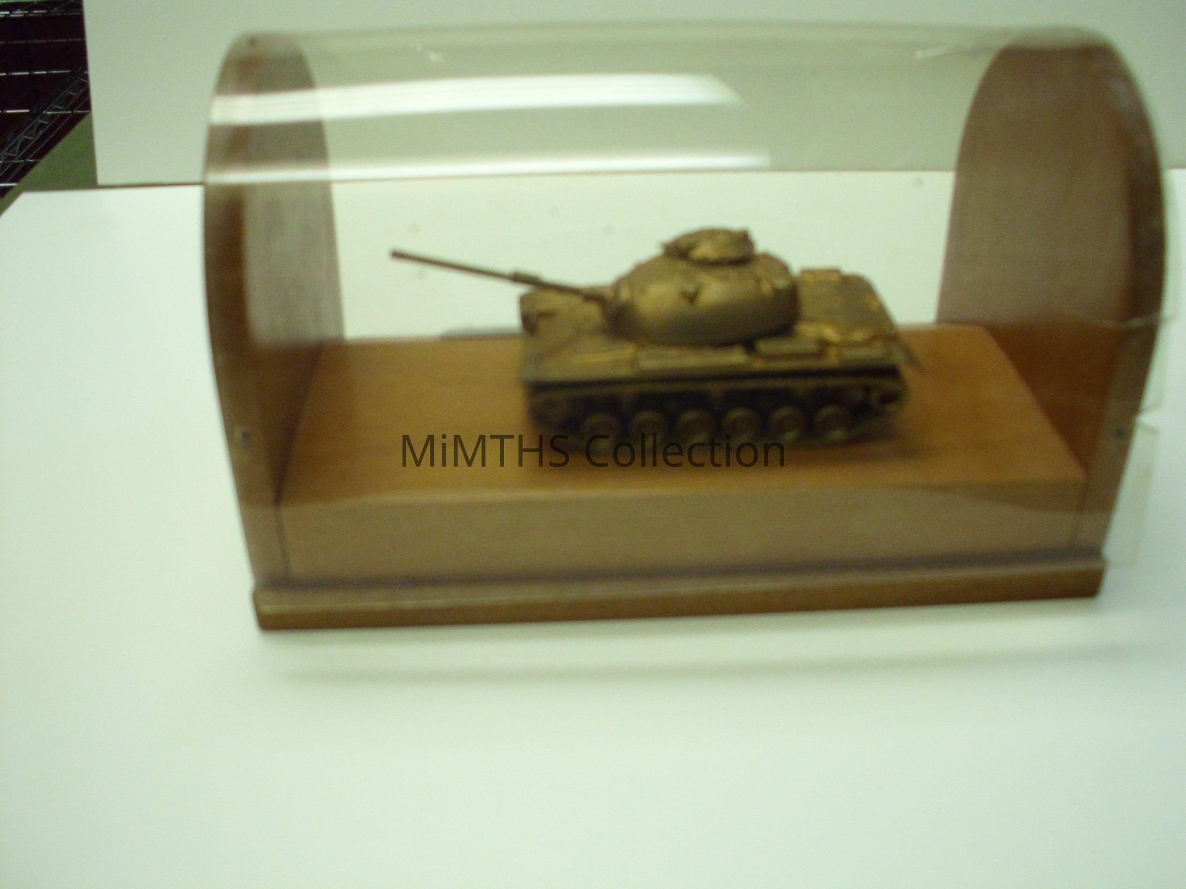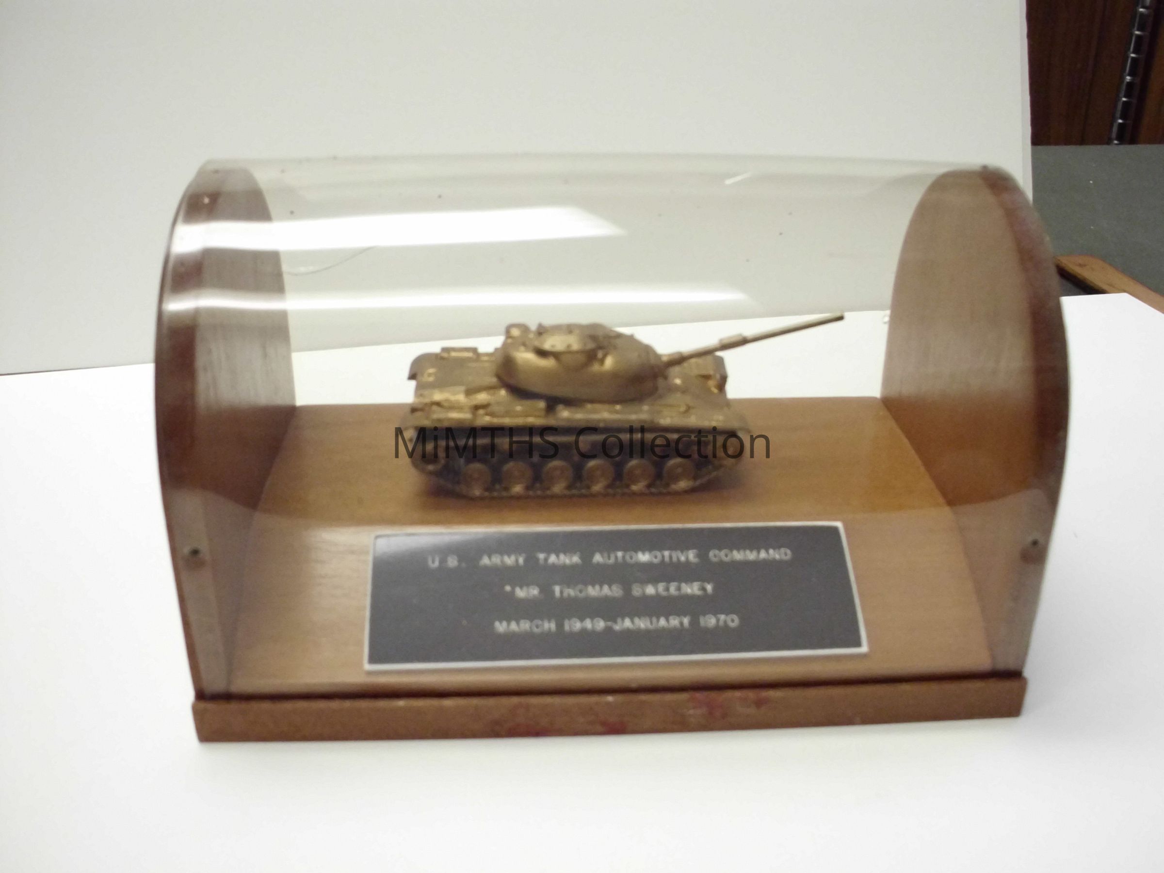 4x4x7 in wood display with a gold model of an M-48 Tank. Given to Thomas Sweeny, US Army Tank Automotive Command, March 1949- January 1970Cataloged By