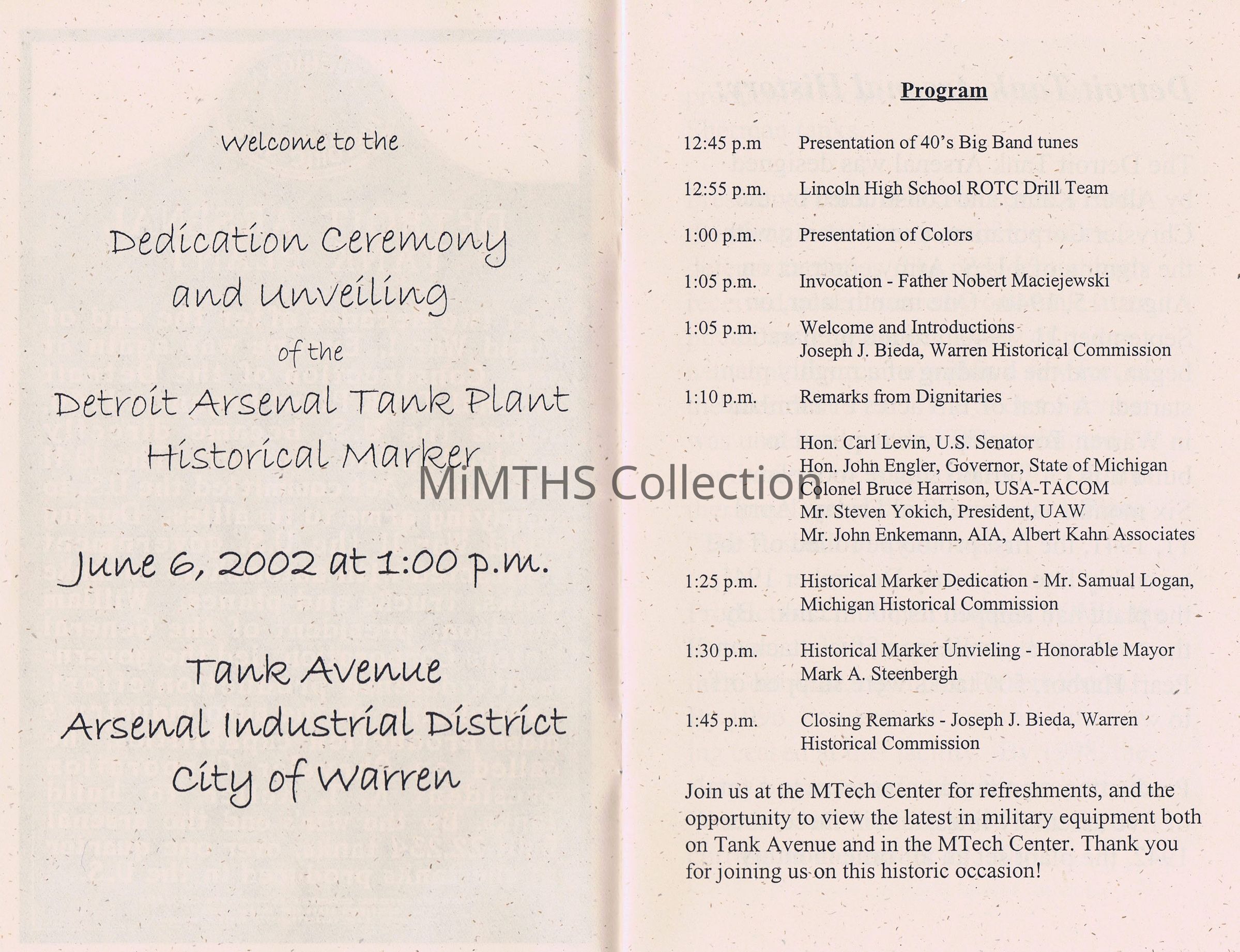 Program from the dedication of the Warren tank Plant Historic Marker, June 6, 2002Cataloged By