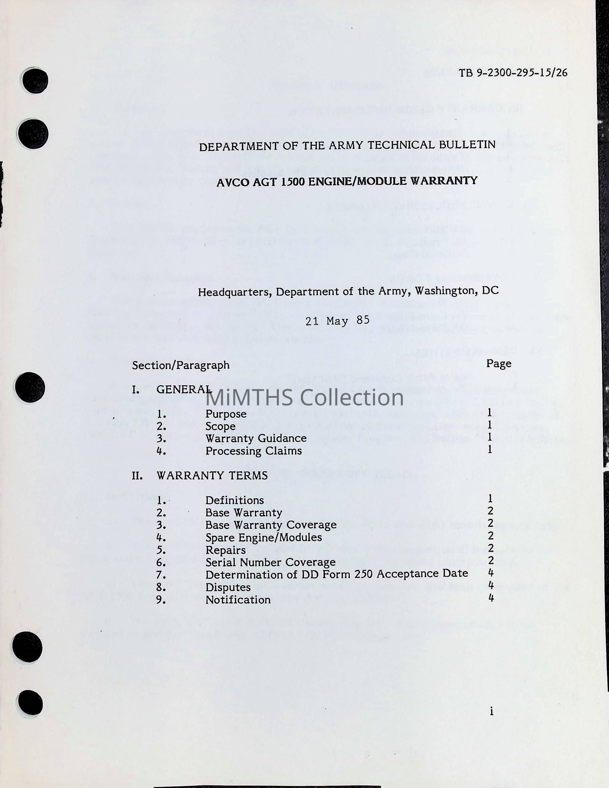Department of the Army Technical Bulletin AVCO AGT 1500 Engine / Module Warrantry. TB 9-2300-295-15/26.Cataloged By