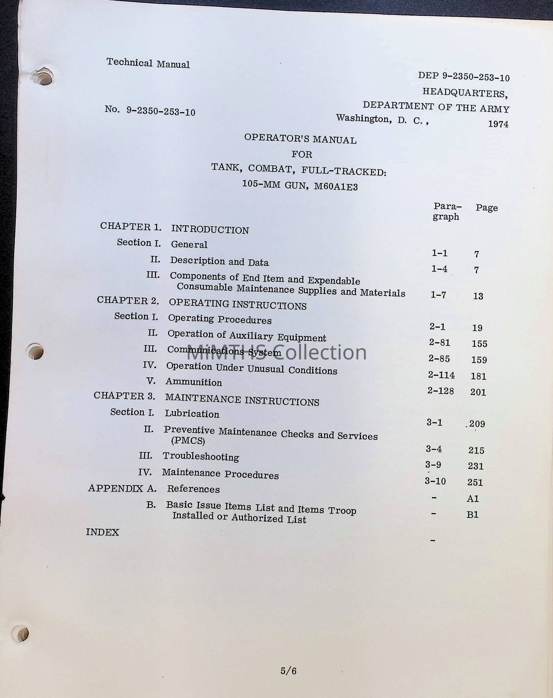 Technical Manual 9-2350-253-10 Operator's Manual for Tank, Combat, Full Tracked: 105 MM Gun, M60A1E3Cataloged By