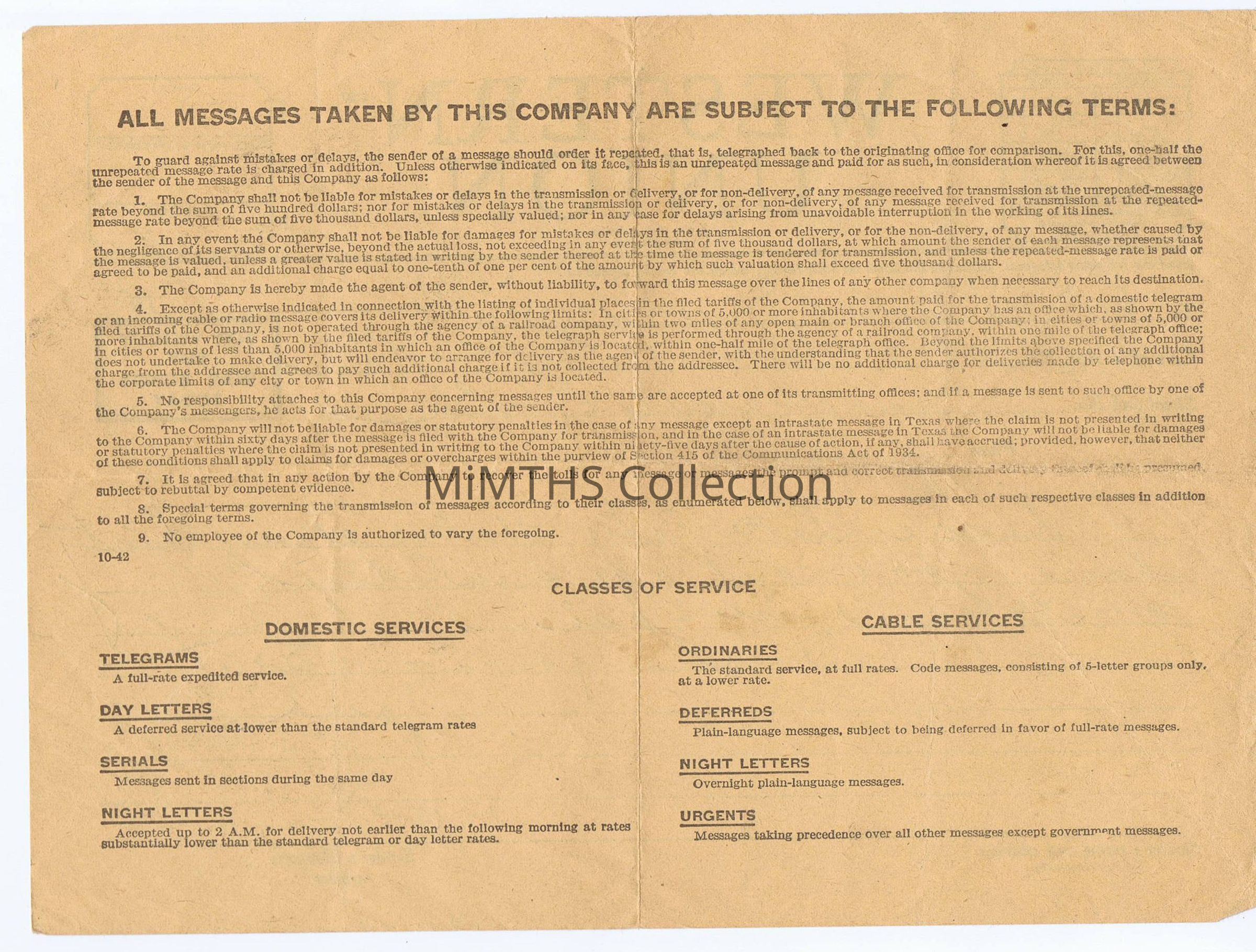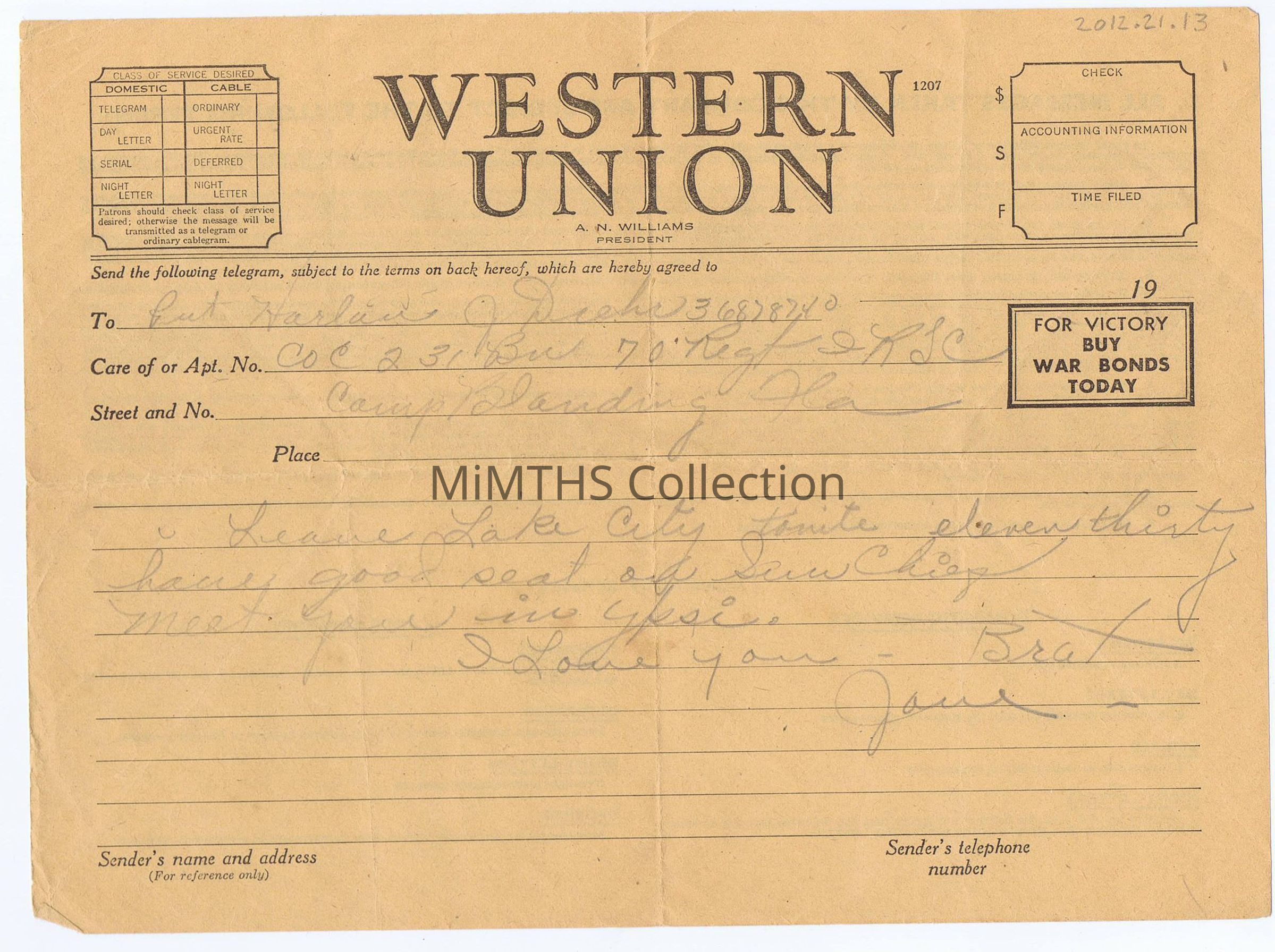 Telegram to Pvt Harlan J Diehr at Camp Balding from Olive Jane Teets. "Leaving Lake City tonight eleven thirty have good seat [...] Meet you in Ypsi. I love you."Cataloged By