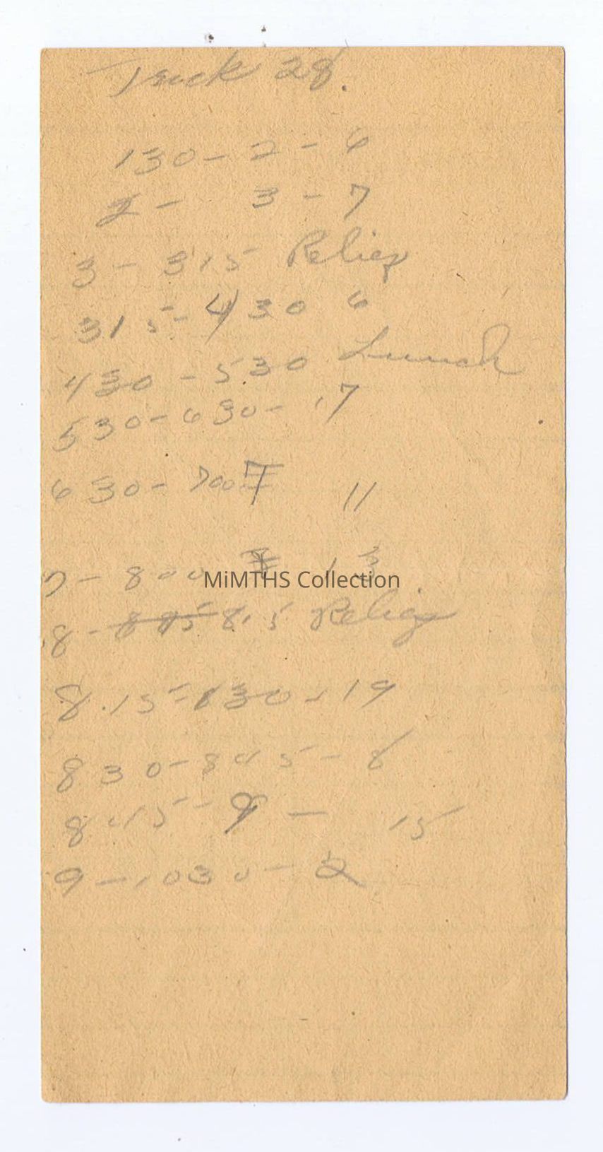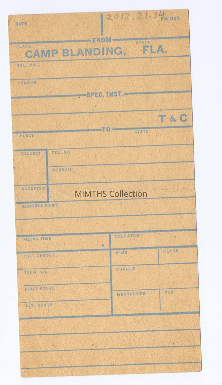 Camp Balding, FL telephone operator form. Notes penciled on back (looks like phone numbers), front of form is blank except for the pre-printed location. Darker print of paper, doesn't appear browned or yellow.Cataloged By