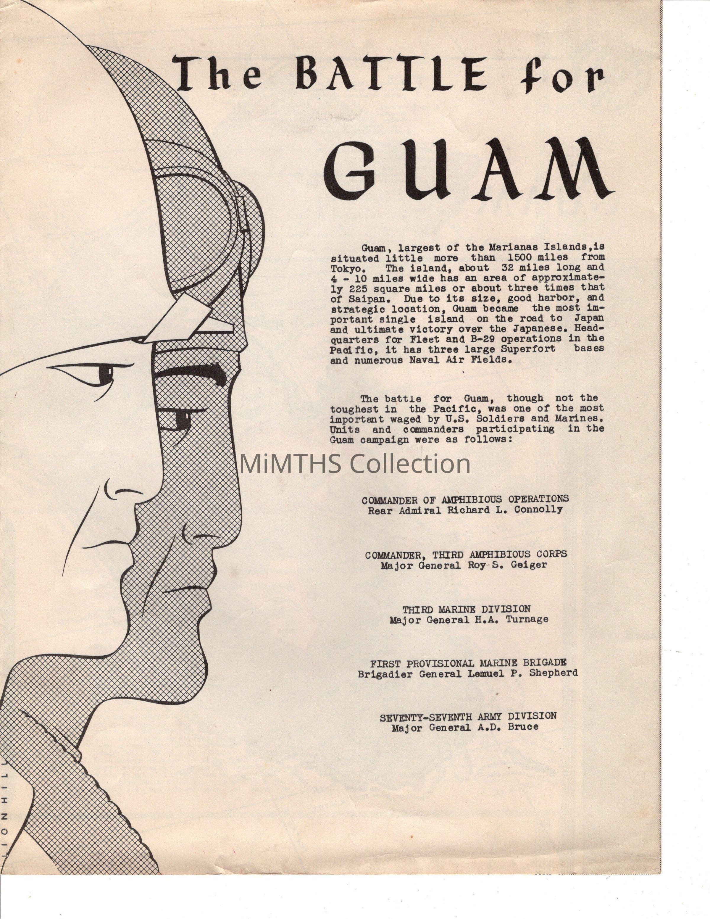 Pamphlet that overviews the battle for Guam during World War II. Printed by the 947th Engineer Aviation Topographic Company.Cataloged By