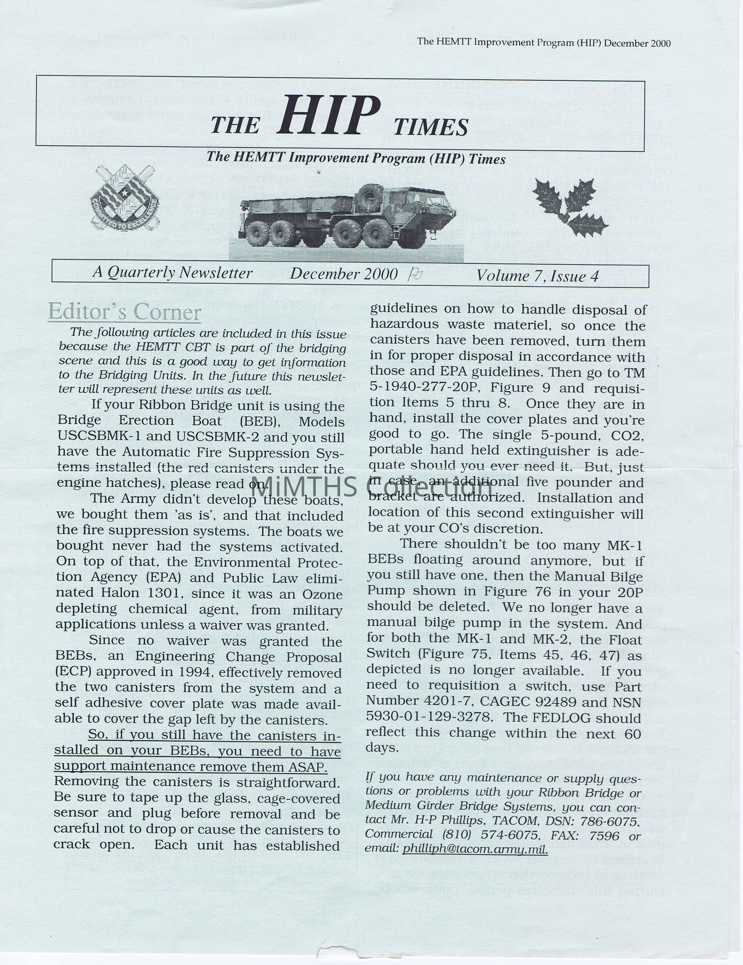 THE HIP (HEMTT Improvement Program) Times, Volume 7, Issue 4, technical information newsletter published by TACOM, Warren MichiganCataloged By