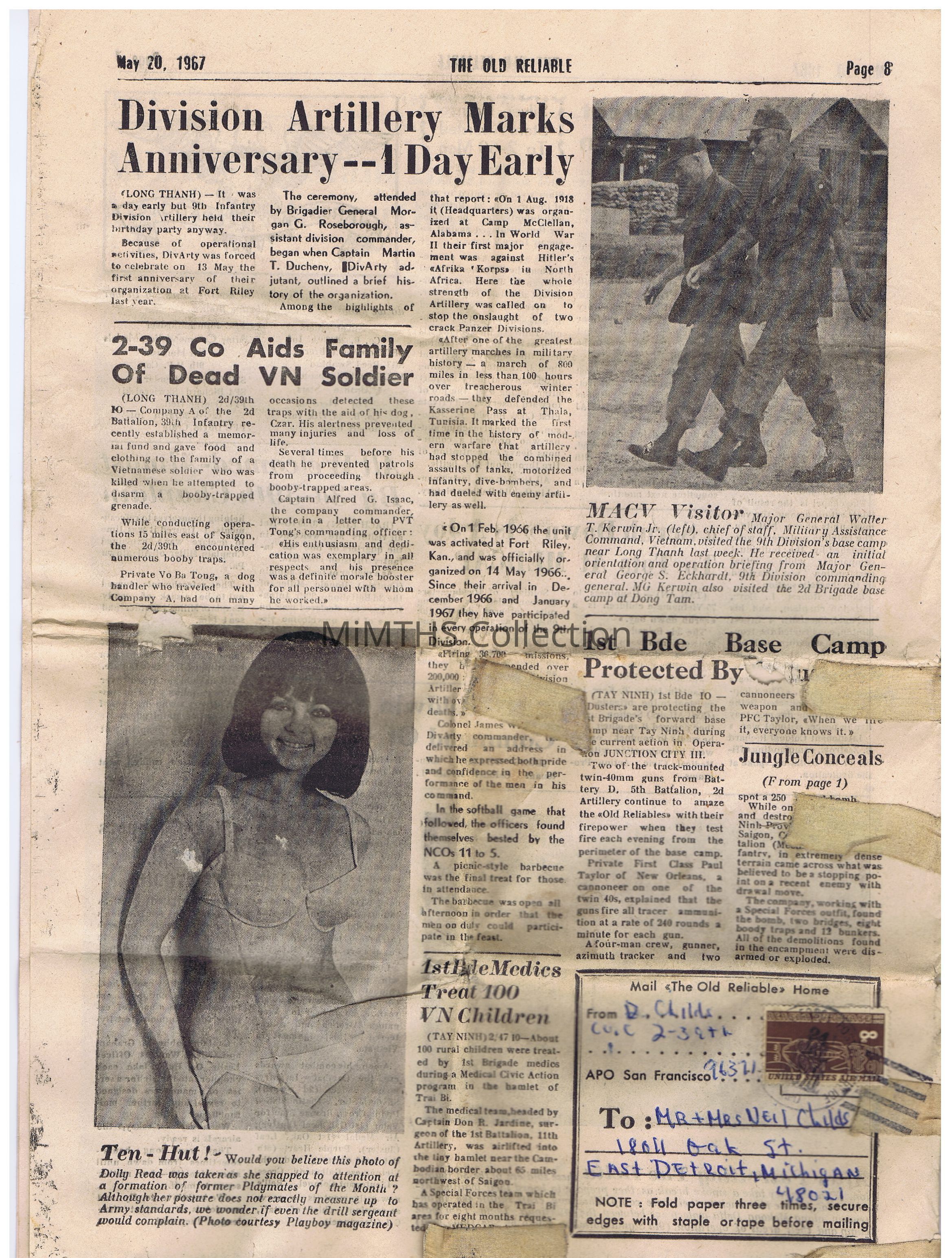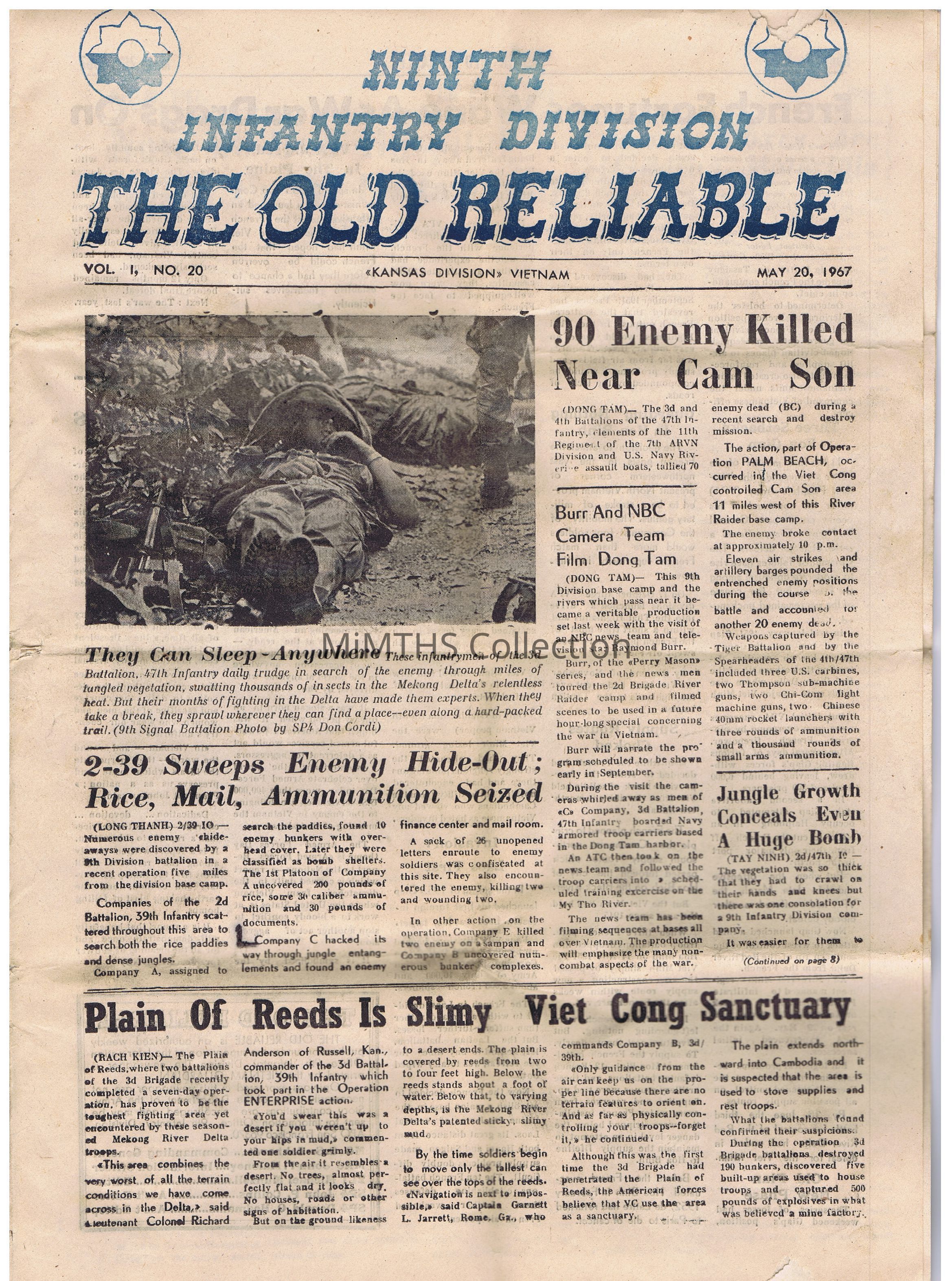 Nineth Infantry "Kansas" Division newsletter. 16x11.5 in and 8pgs. Back page allows soldiers to write a home address and mail the paper home. Dated May 20, 1967