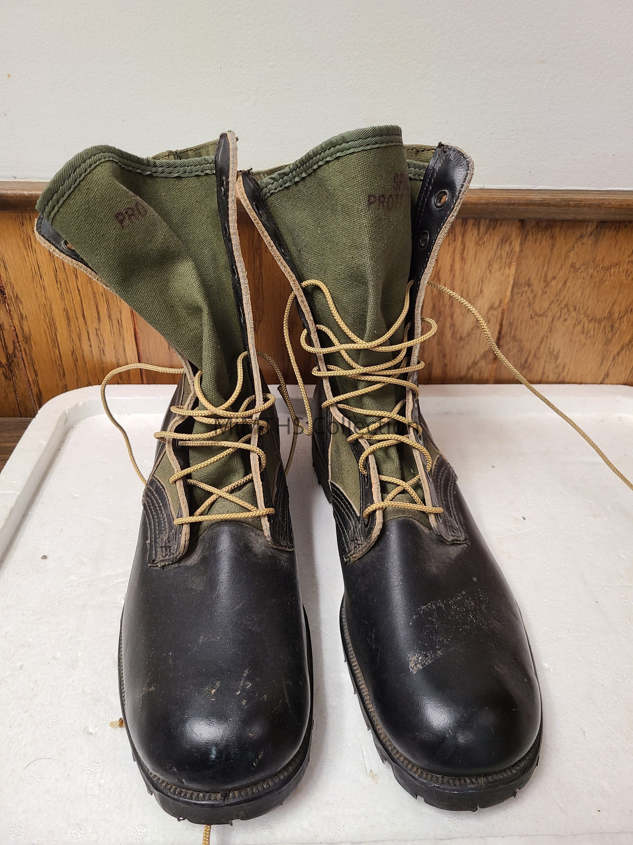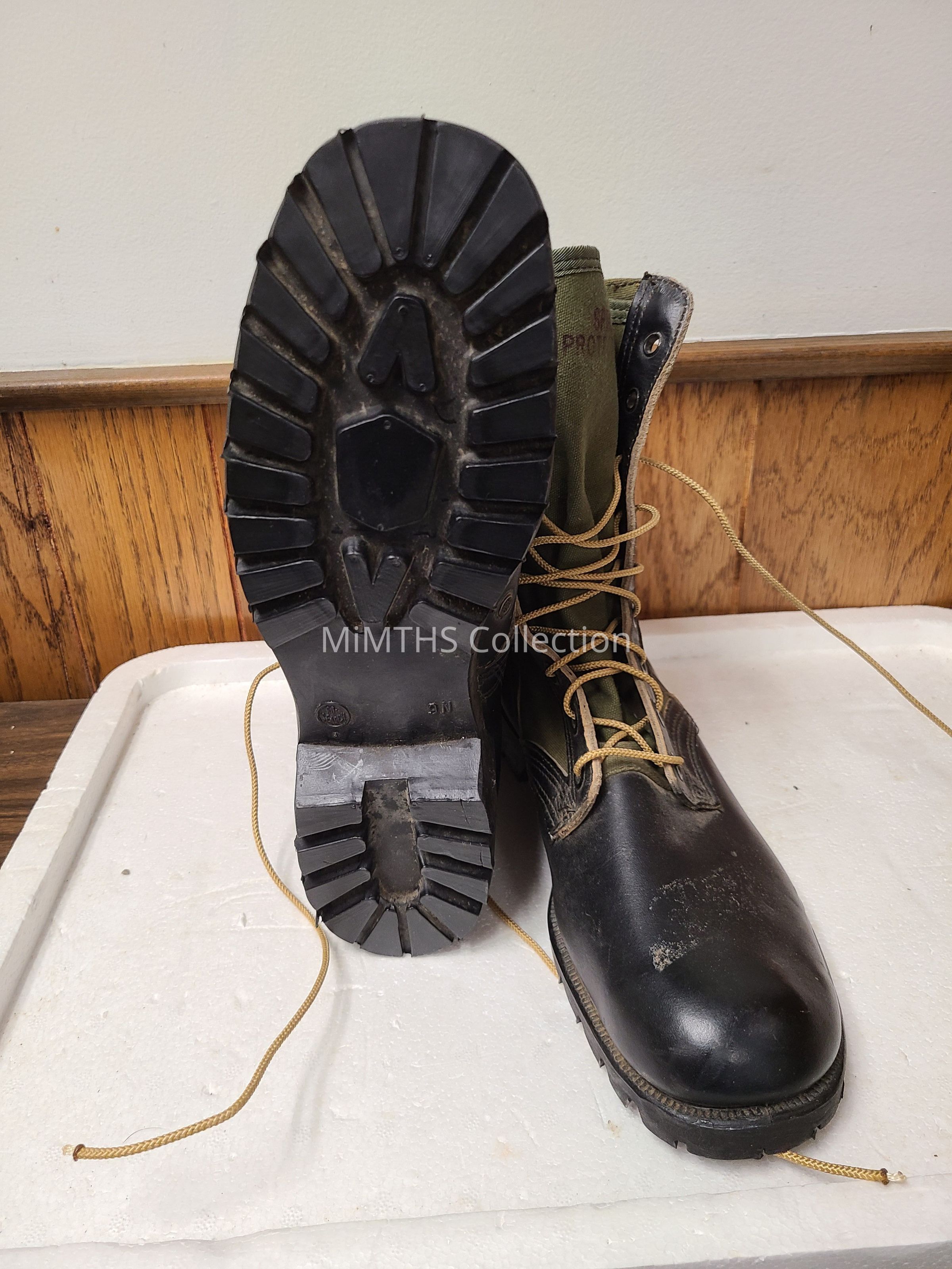 This boot featured the same all cotton upper construction like the first and second pattern, and the second pattern's nylon backstay reinforcement and top binding. The most noticeable difference is the addition of a nylon ankle reinforcing band. These boots were first issued with the same Vibram Sole of the first and second model jungle boots. However, they were improved in 1966 with the introduction of the new Spike Protective Sole which consisted of a steel plate bonded into the footbed of the DMS Vibram pattern sole.Cataloged By