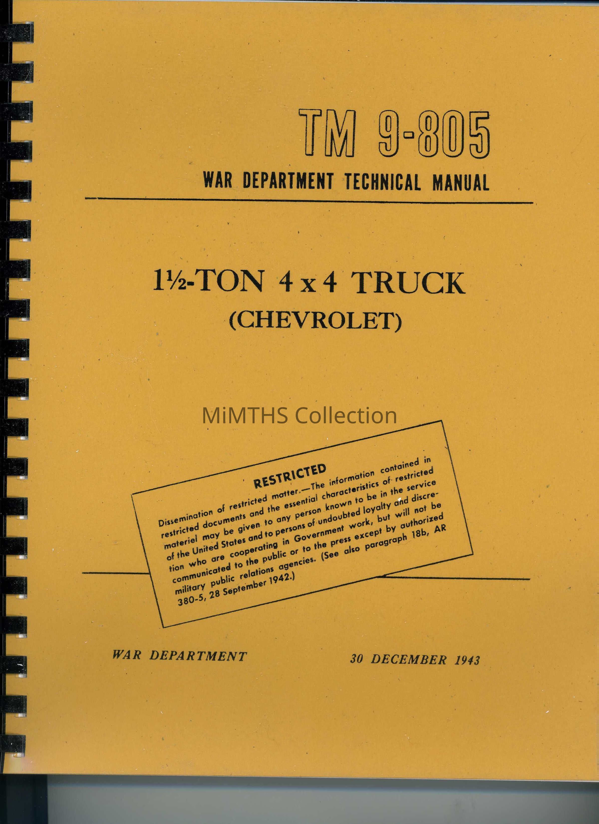 War Department Technical Manual TM 9-805 1-1/2 ton 4x4 Truck (Chevrolet) Modern Reprint