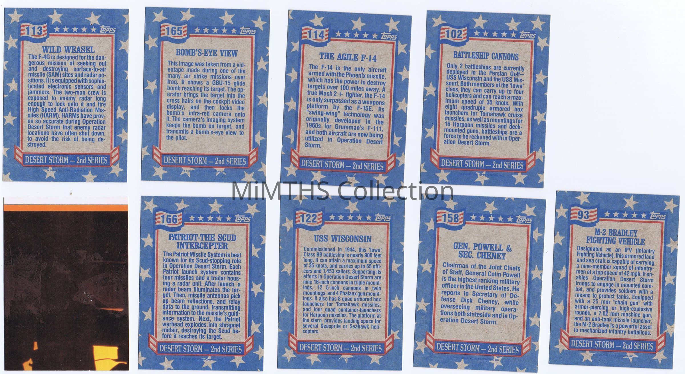 Set of 8 cards and 1 sticker (typically a flag) produced by the Topps Trading Card Company as a special edition run during the Gulf War. These are part of the "Victory Series" to commemorate Operation Desert Storm. These cards were educational.Cataloged By