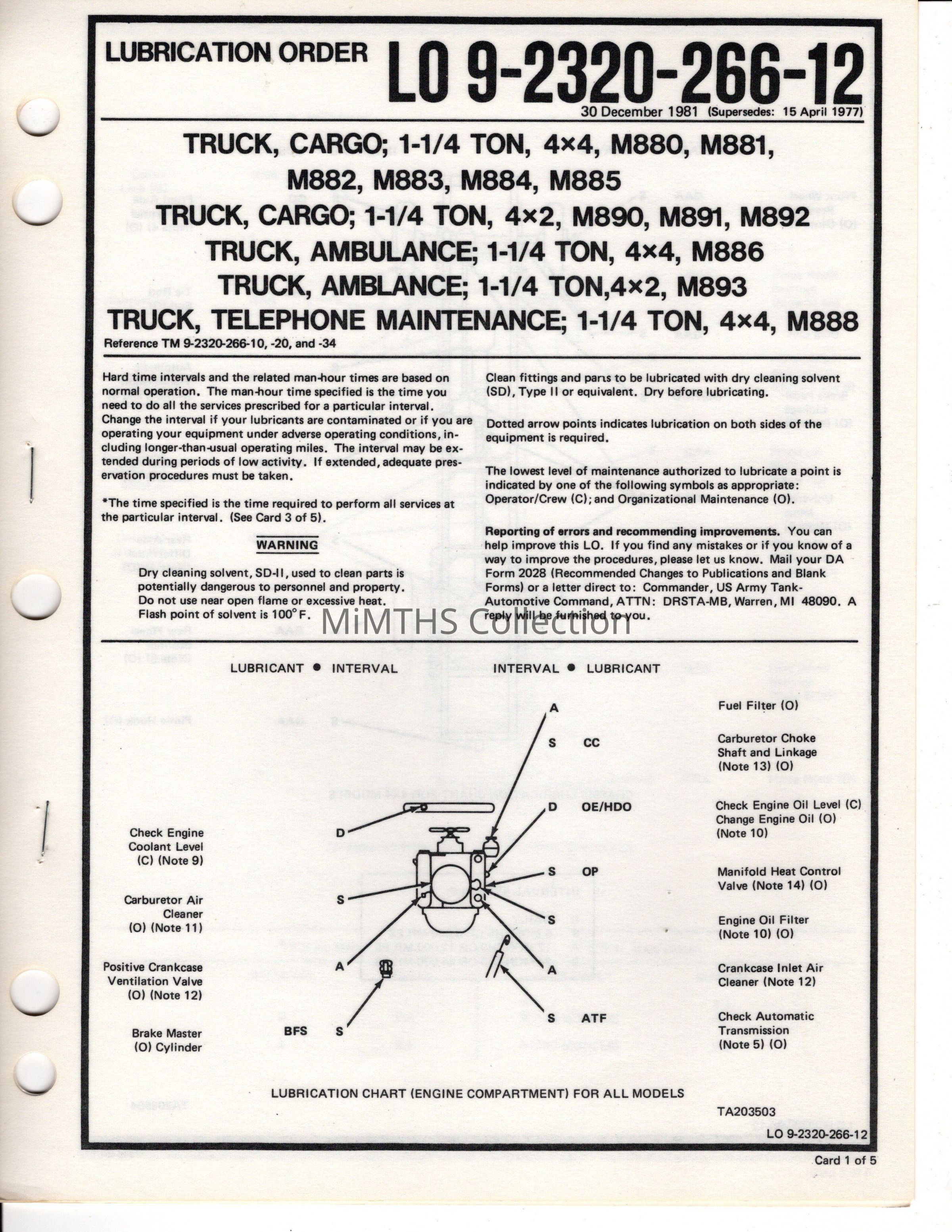 Lubrication Order, Truck Cargo; 1-1/4 Ton, 4x4, M880, M881, M882, M883, M884, M885, et al