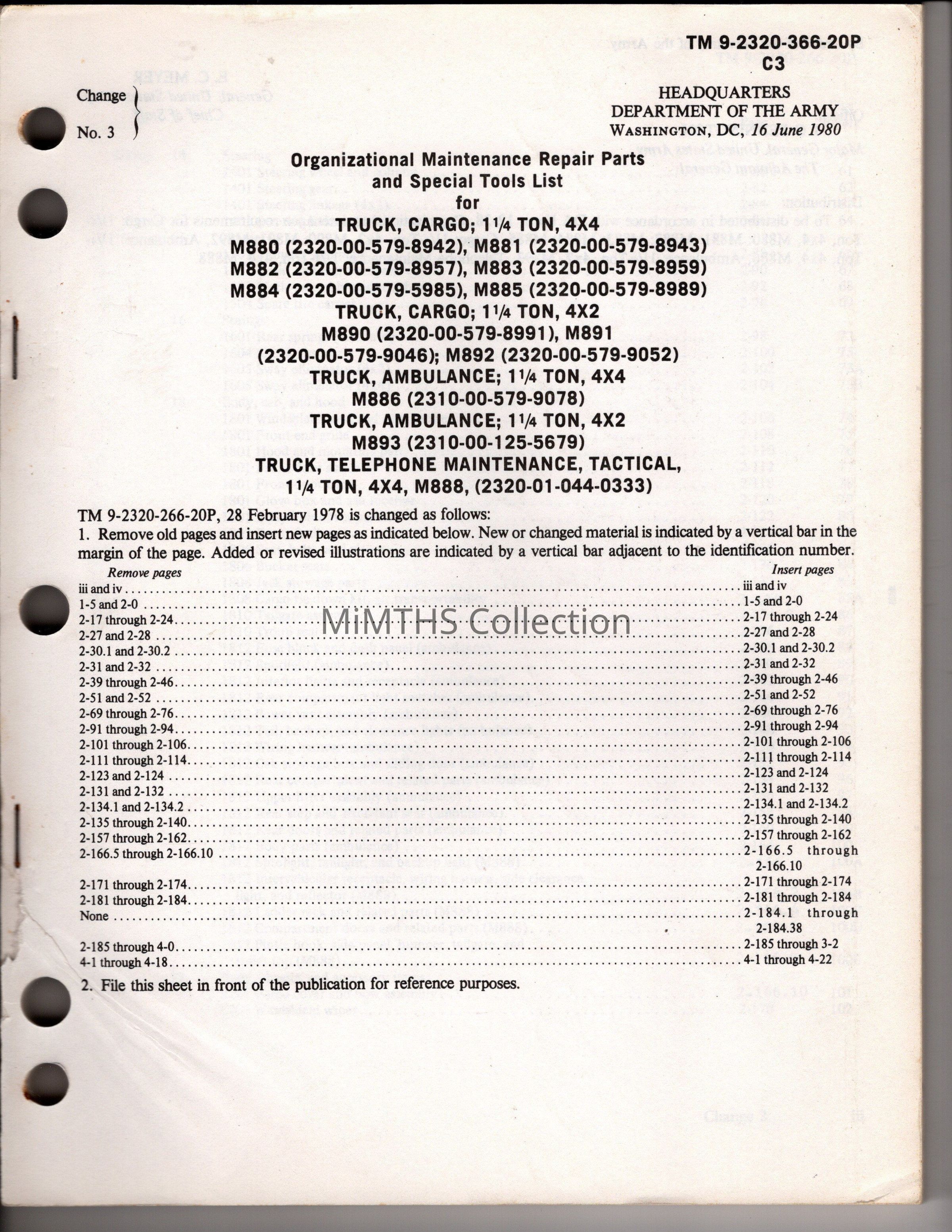 Organizational Maintenance Repair Parts and Special Tools List for Truck, Cargo; 1-1/4 Ton, 4x4, M880 (2320-00-579-8942), et al, Change 3