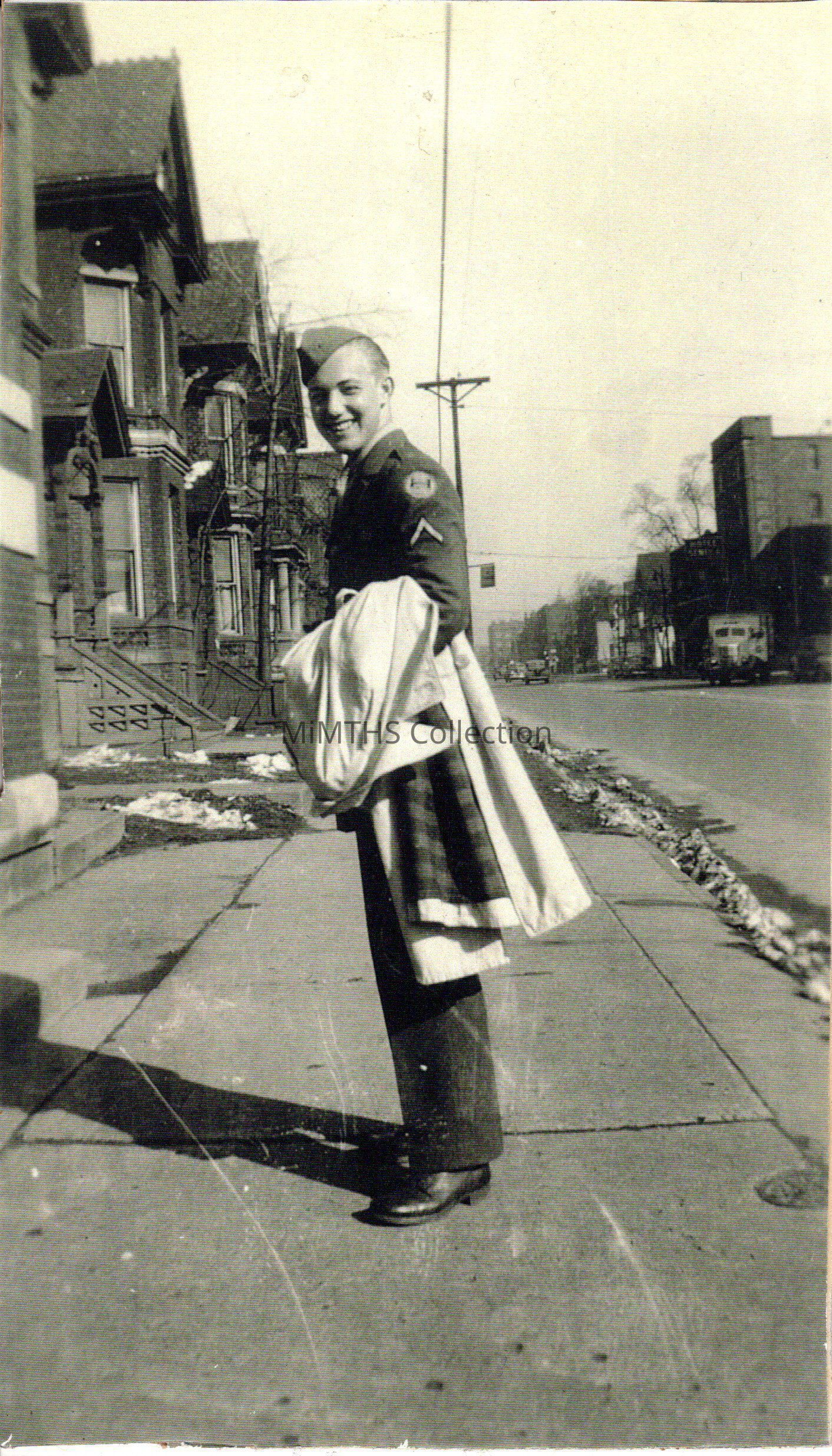 Photograph of an unknown person in a Michigan State Troops unform with Private rank. Appears to be holding a civilian overcoat.