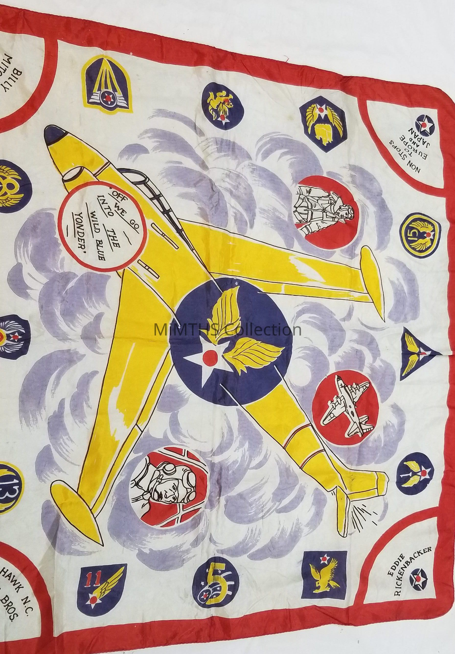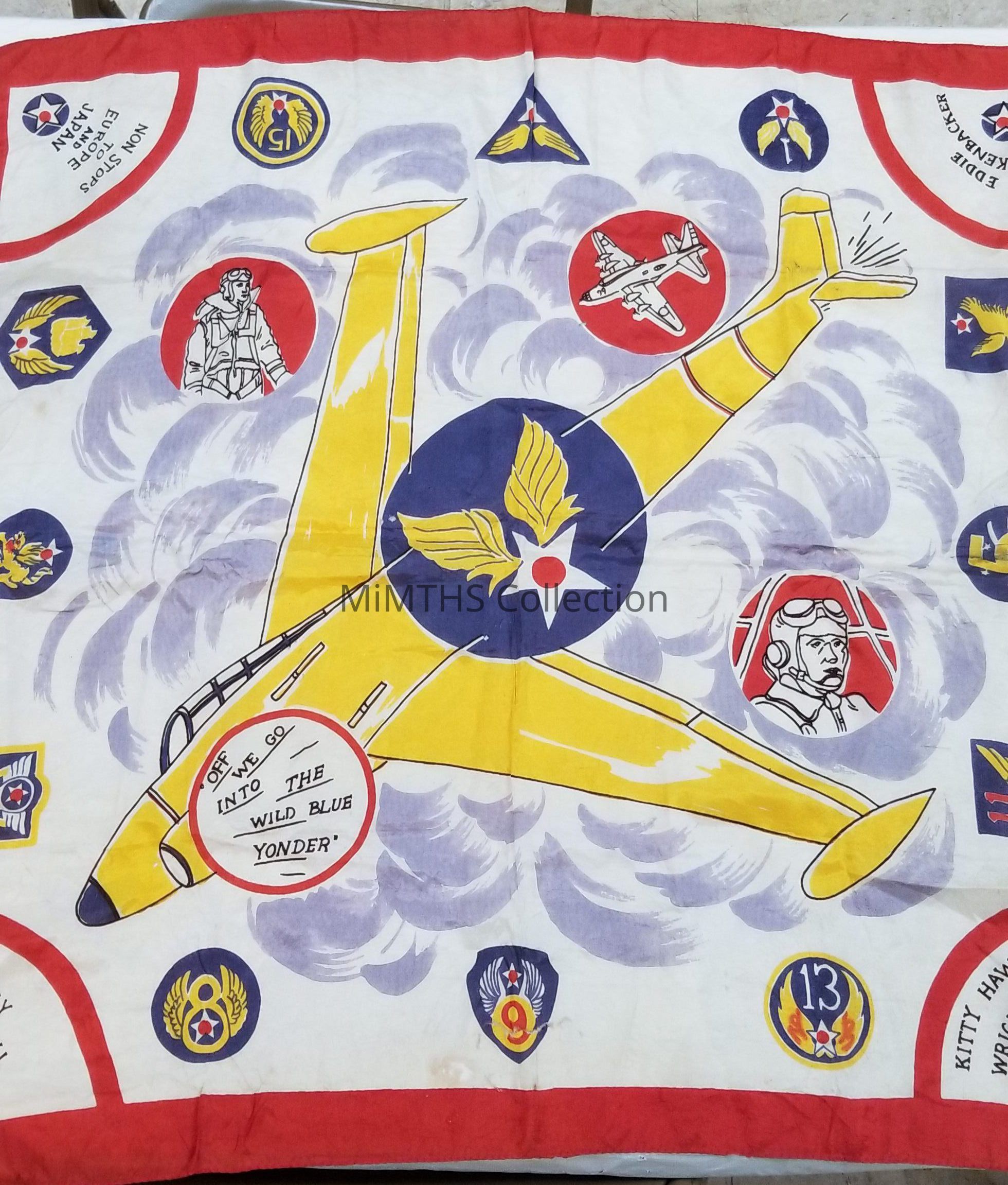 Silk scarf or table cover with the patches of the air forces around the perimeter. Features a Jet in the center. No date, but probably 1950's vintage.Cataloged By