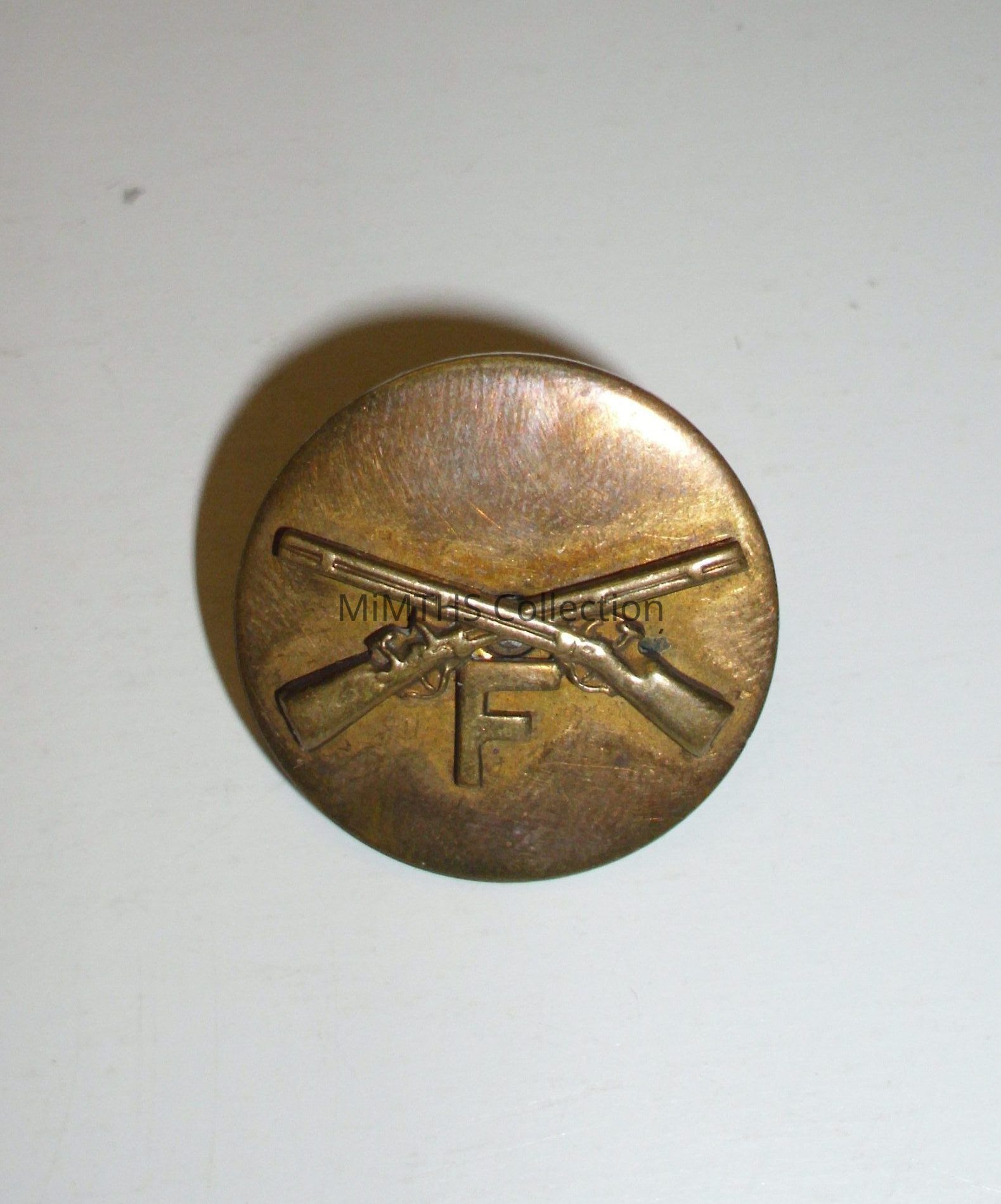 1 screwback US Army collar disk in the post-1936 style. Has the infantry crossed rifles and F. From F co, 125th Infantry MING