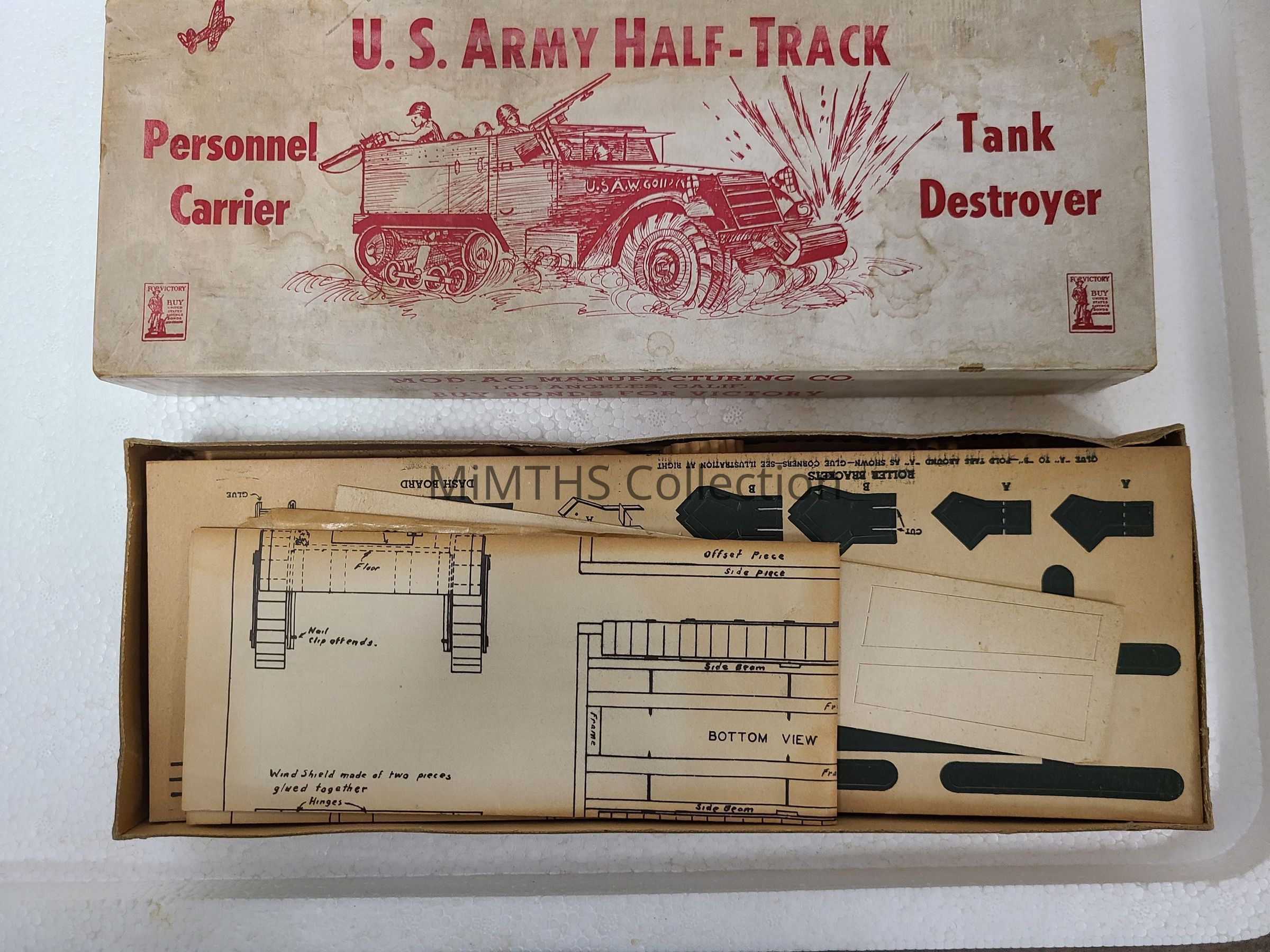 A WWII wartime manufacture American wooden model kit. U.S. Army half track Kit is made by MOD-AC Manufacturing Co, Los Angeles Ca.