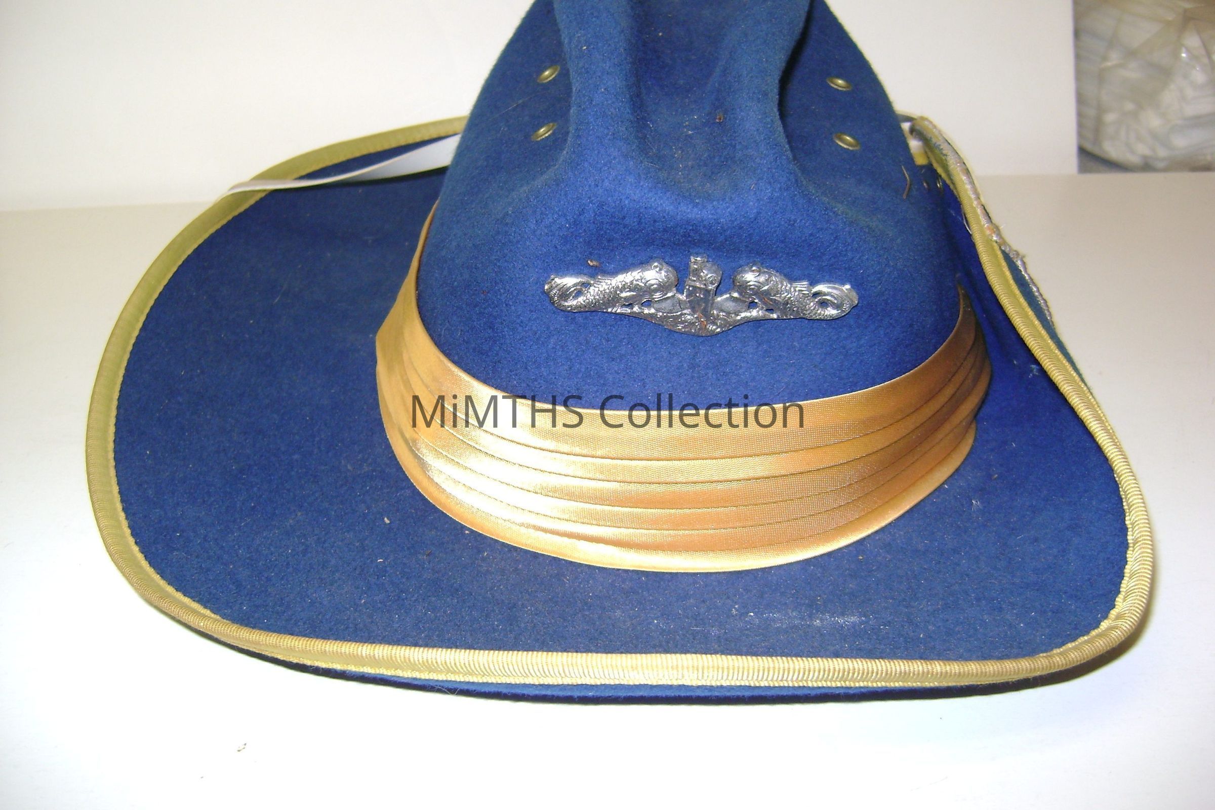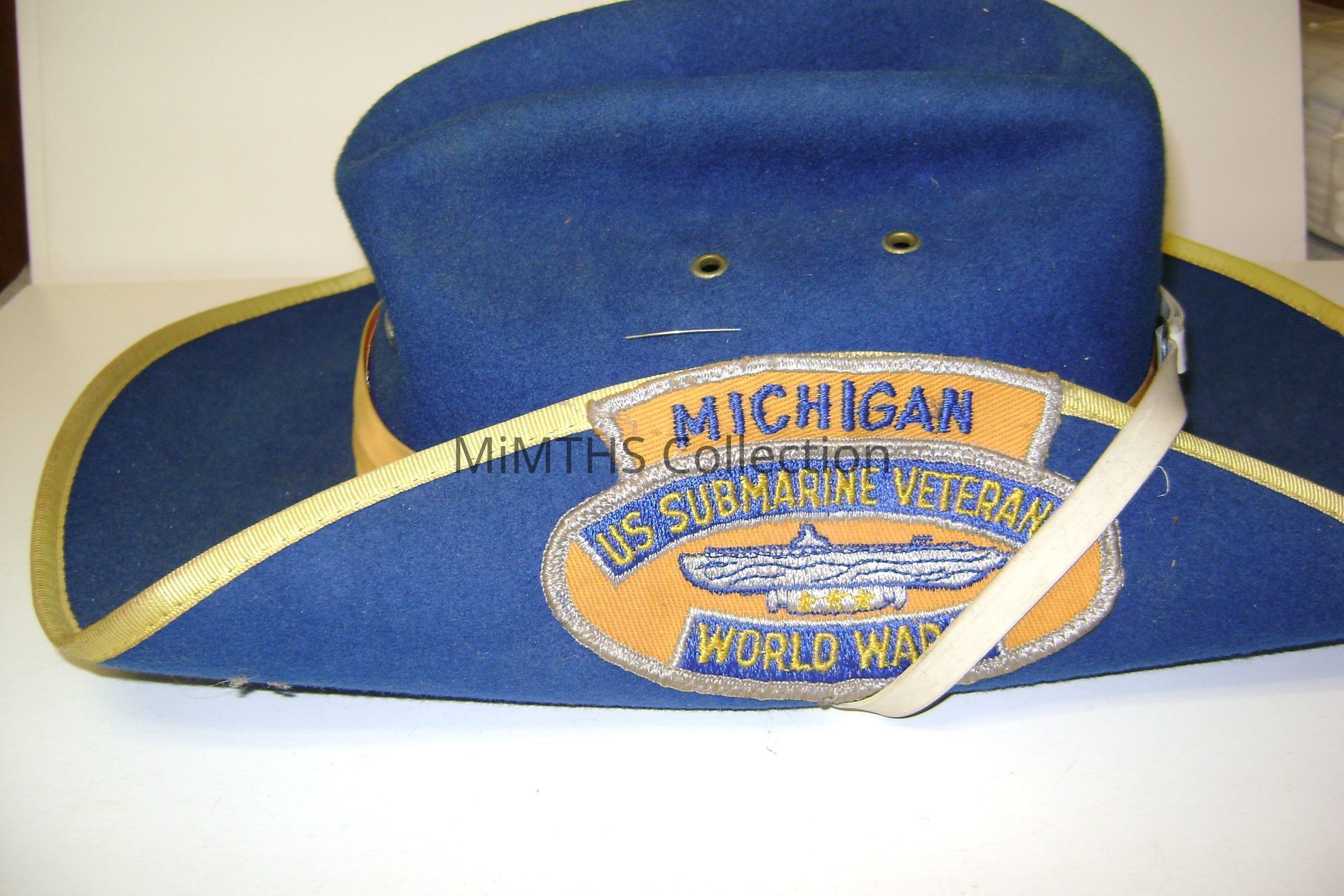 There is a patch on the side that says "Michigan US Submarine Veterans World War II." A submarine insignia pin dons the front of the garmet (Silver pin with two fish facing a submarine). A white band holds the curve of the hat......Cataloged By